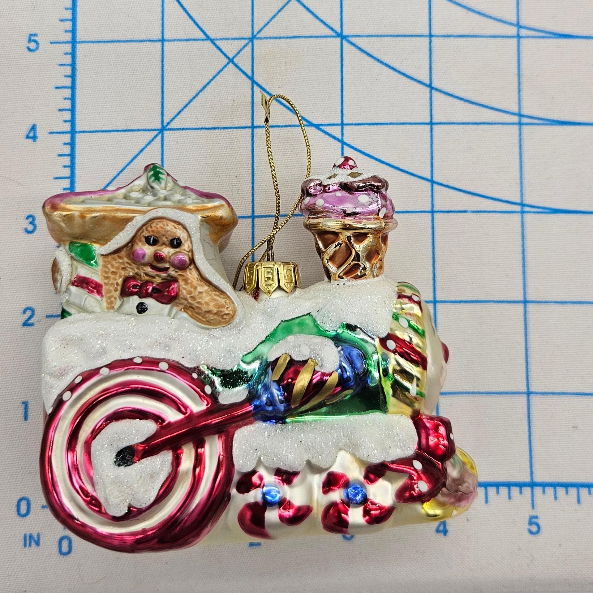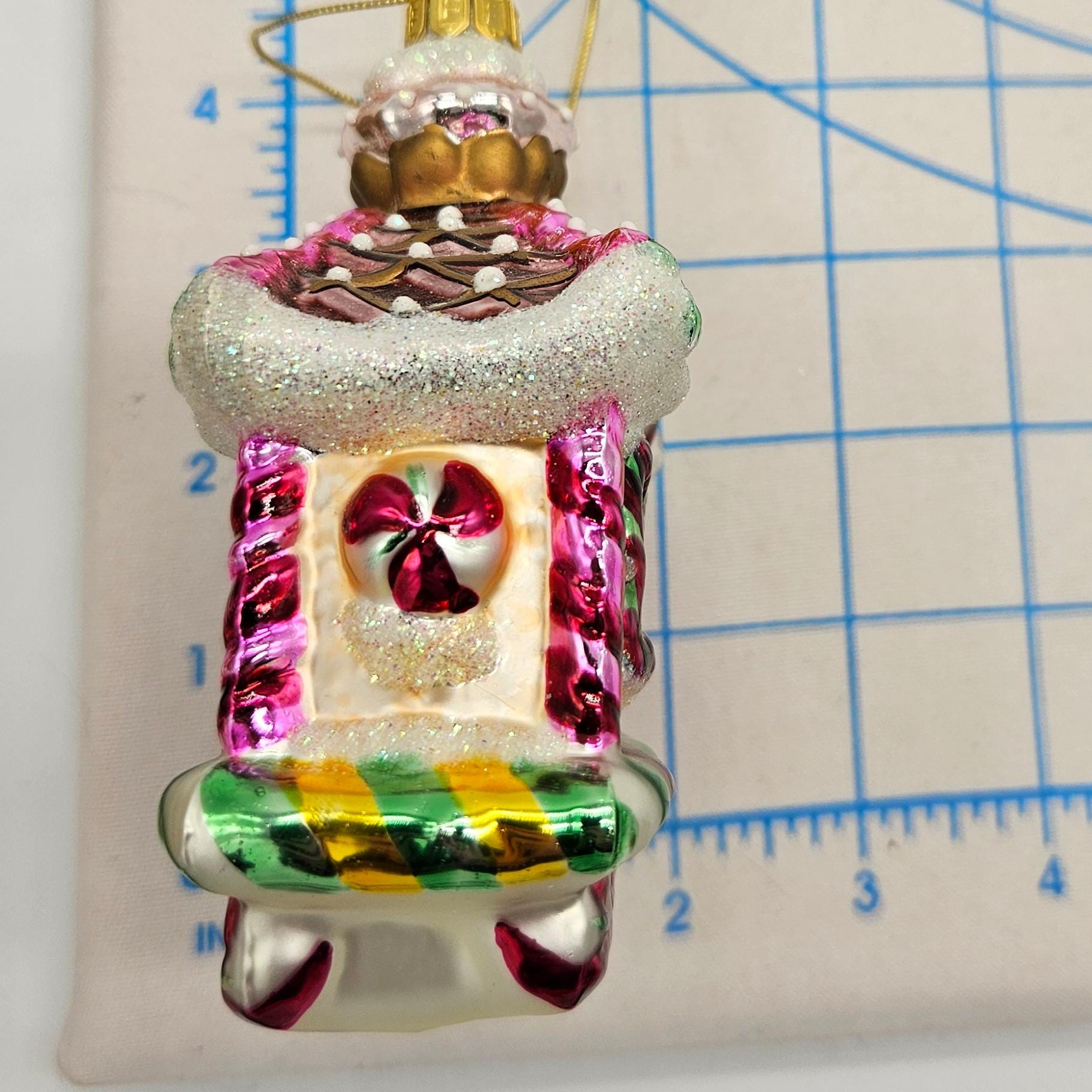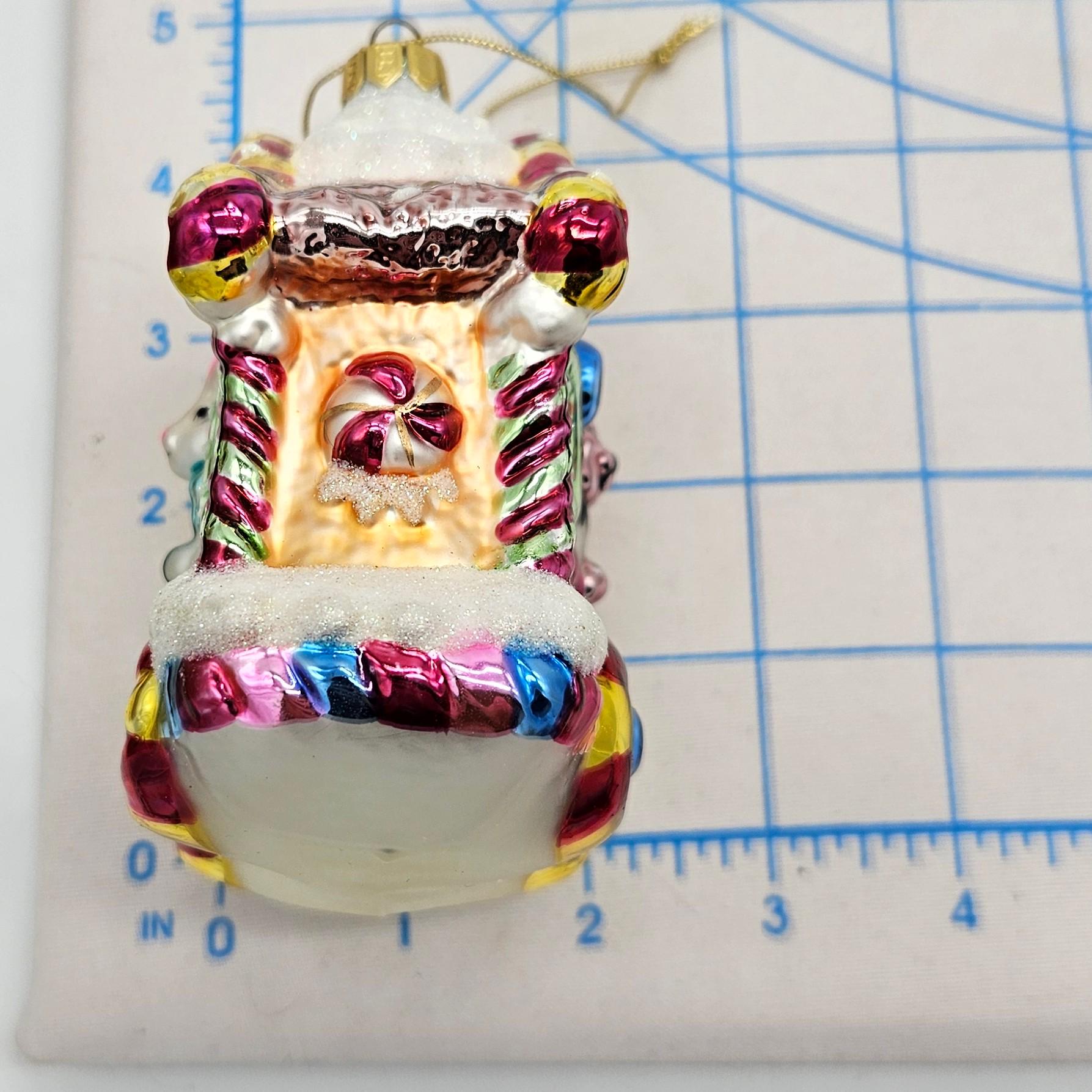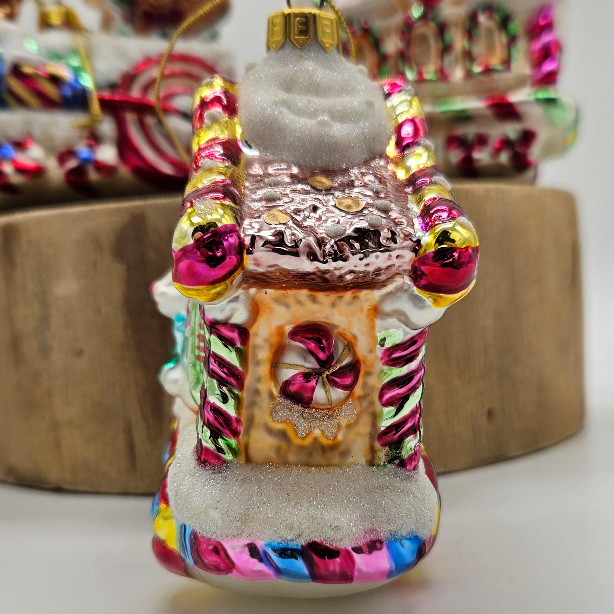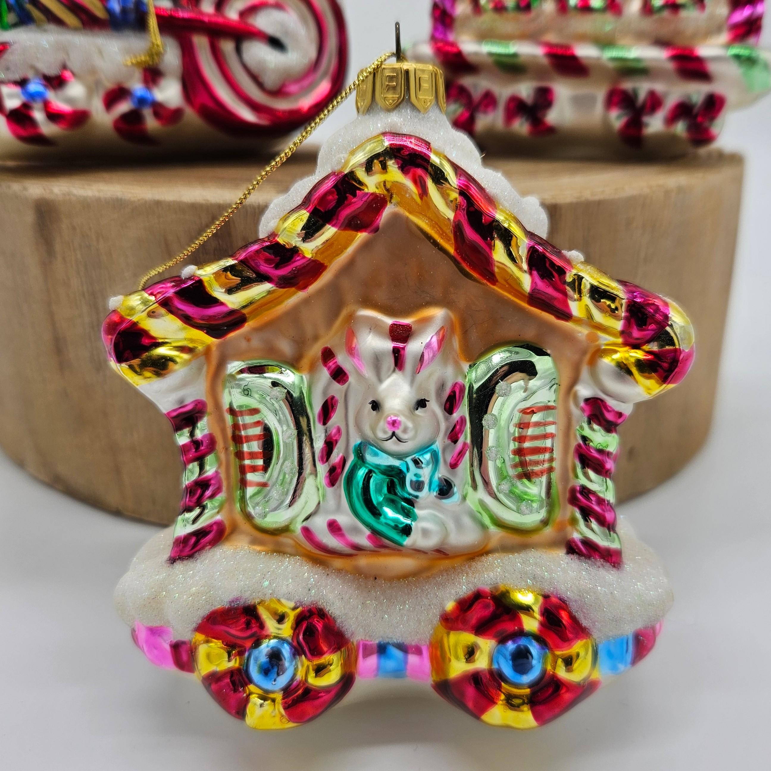 Set of three vintage Fitz & Floyd glass Christmas ornaments featuring a whimsical gingerbread and candy house theme.