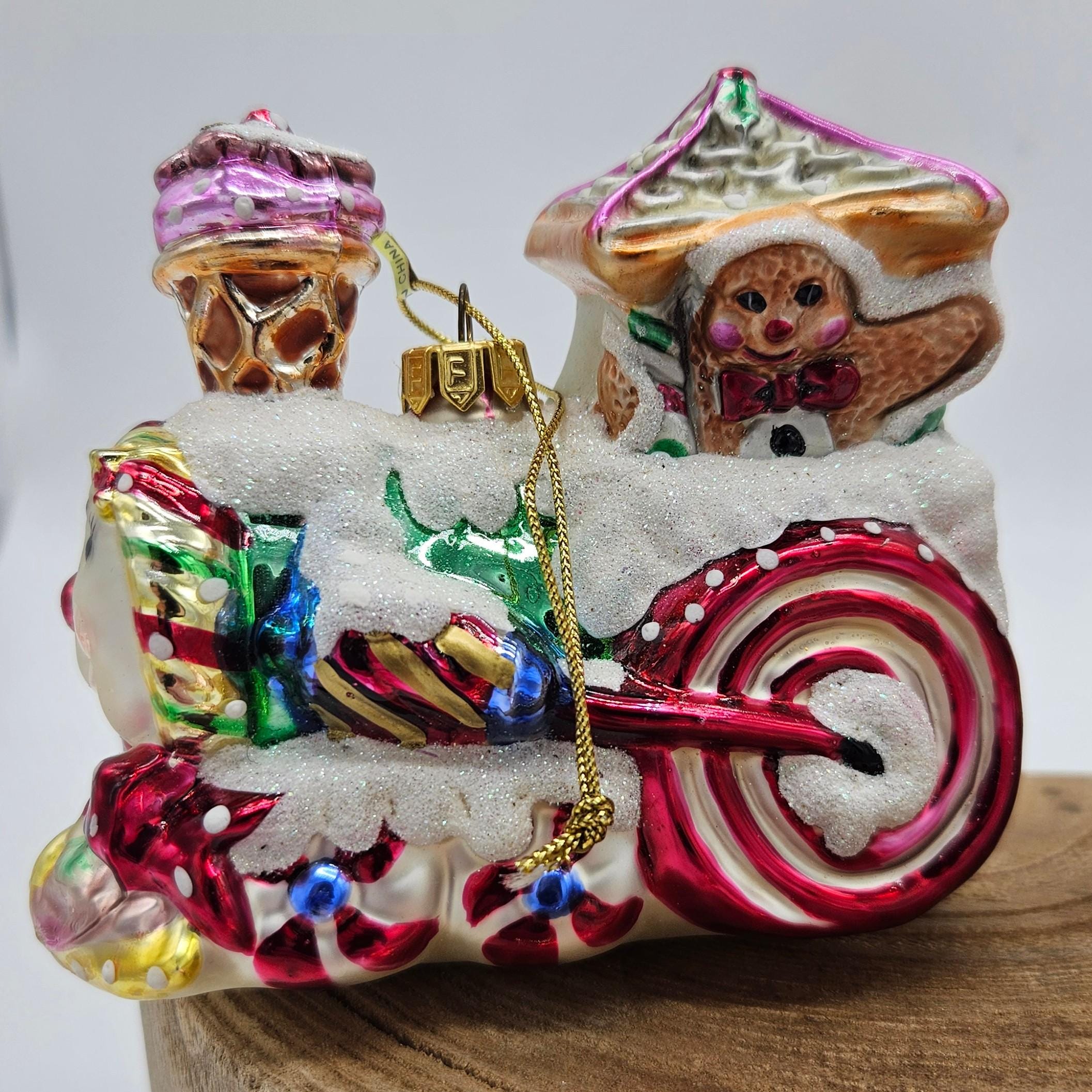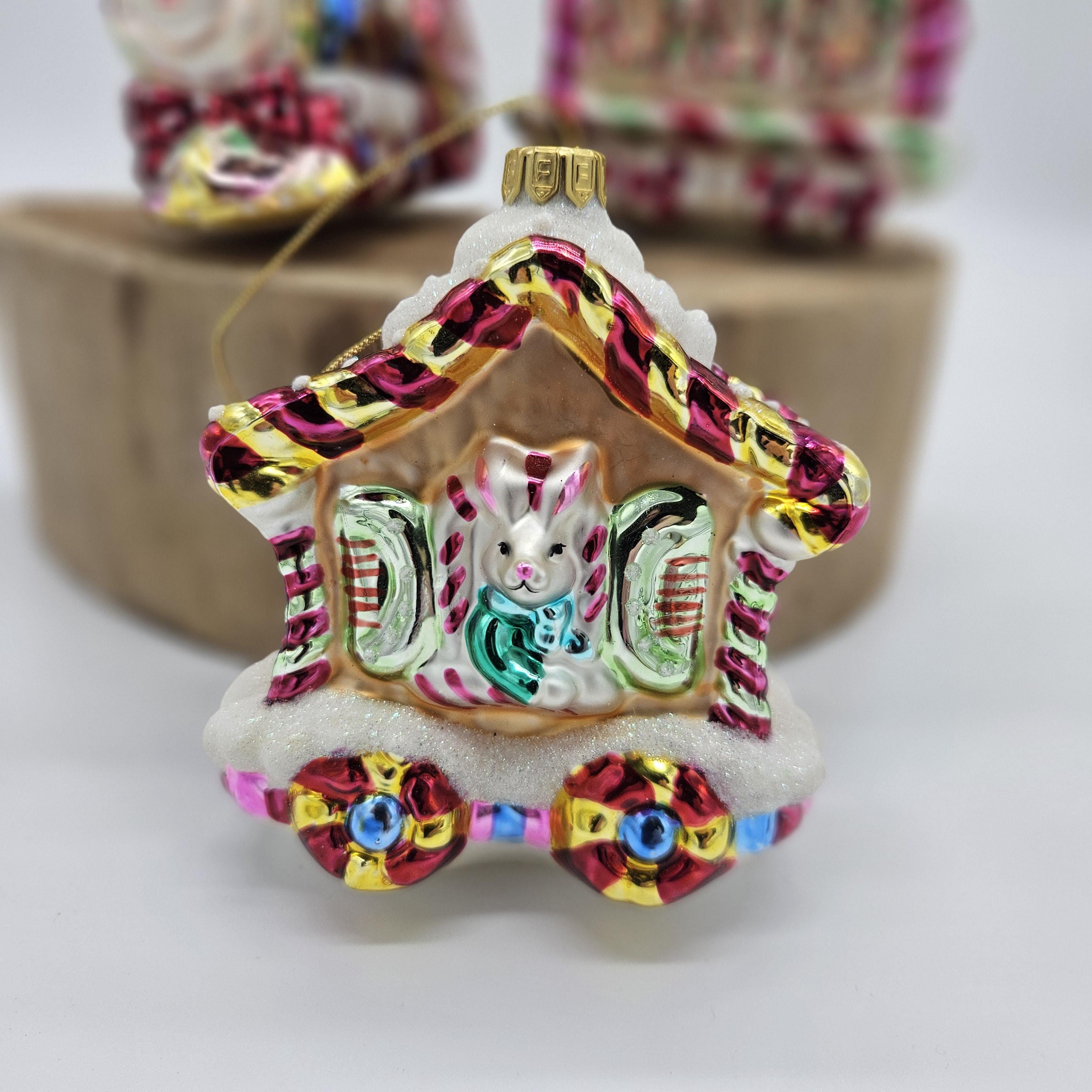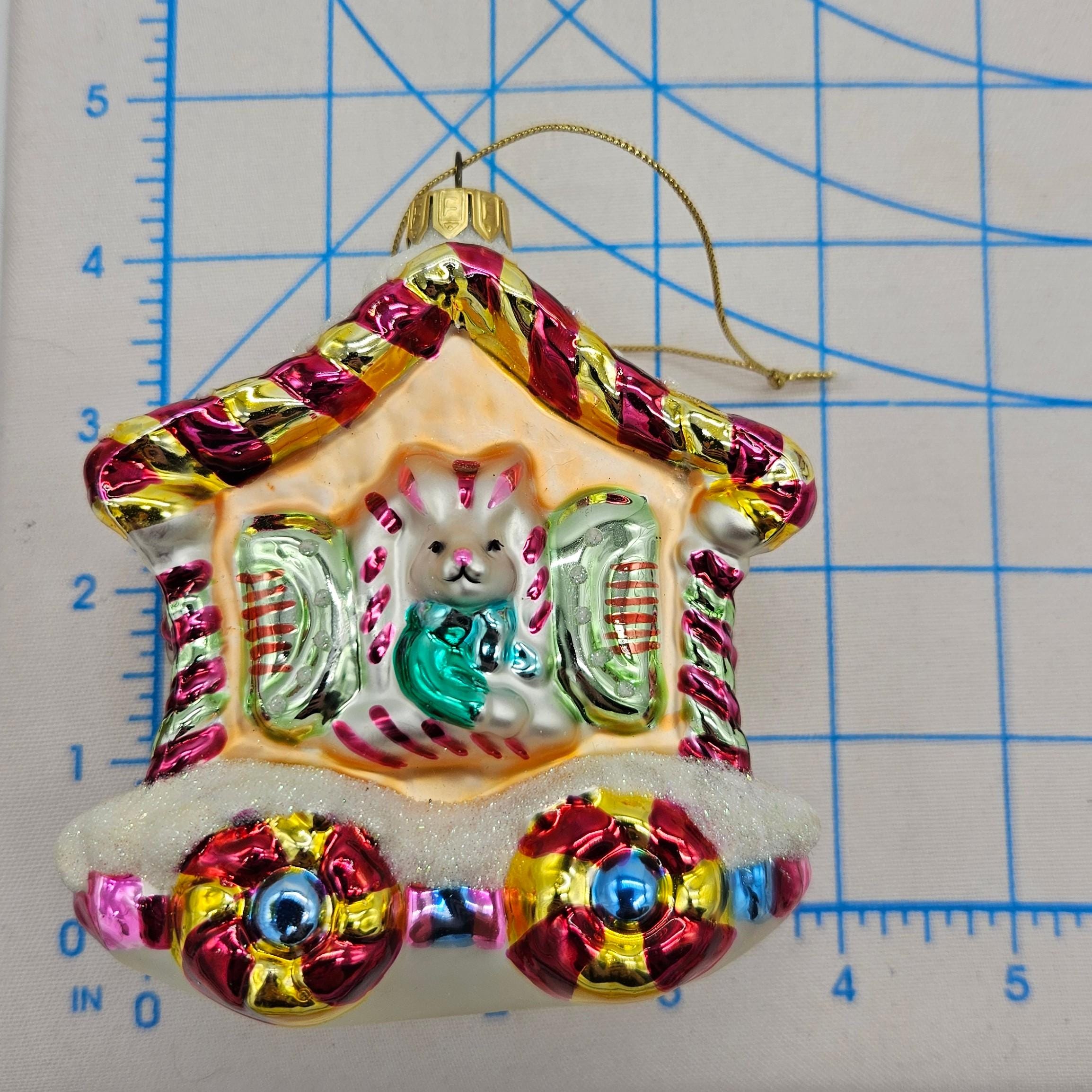 This set includes a gingerbread train with a cookie conductor, a decorated gingerbread house, and a charming bunny gingerbread house. Each ornament is hand-painted with bright metallic candy colors and glitter “snow” accents. The ornament caps are stamped Fitz & Floyd, confirming they are authentic pieces from the brand’s collectible holiday ornament lines. These ornaments are perfect for a gingerbread-themed Christmas tree, holiday village display, or whimsical seasonal decor.