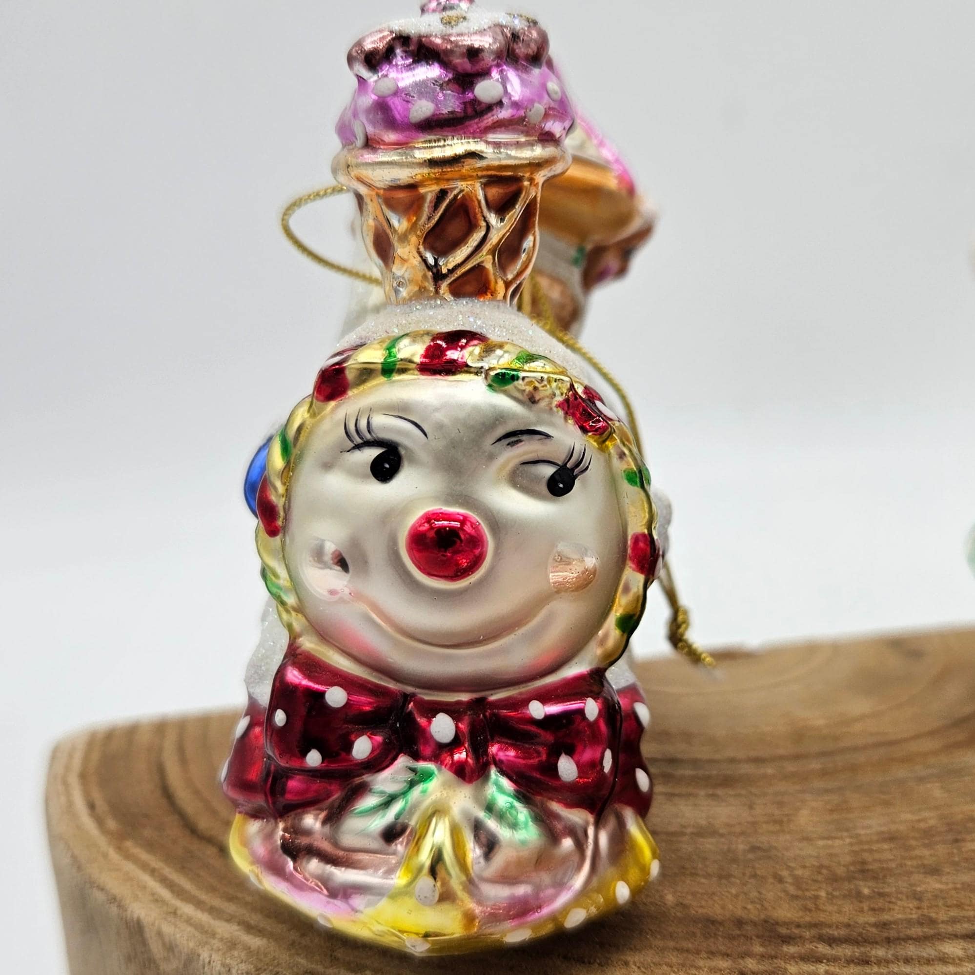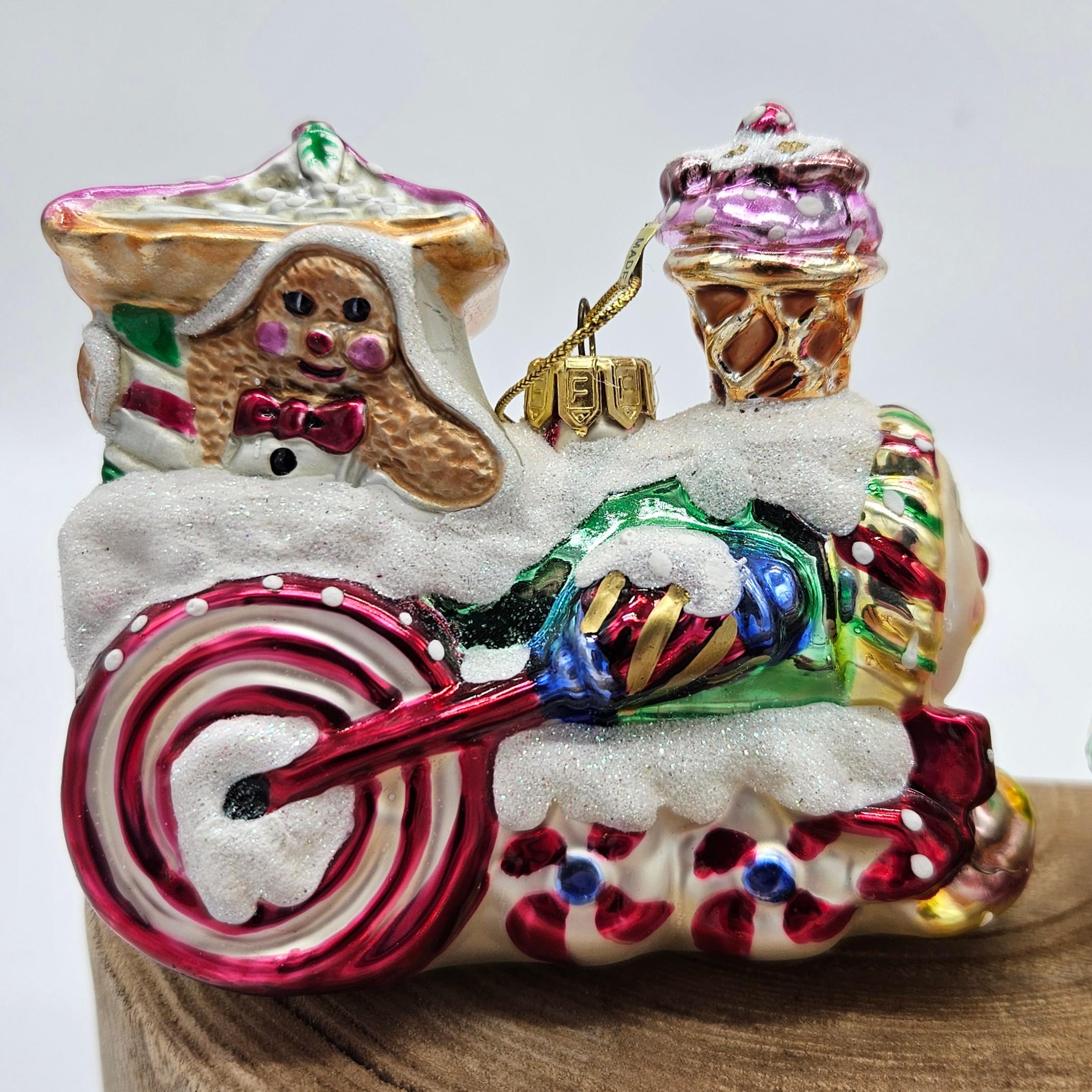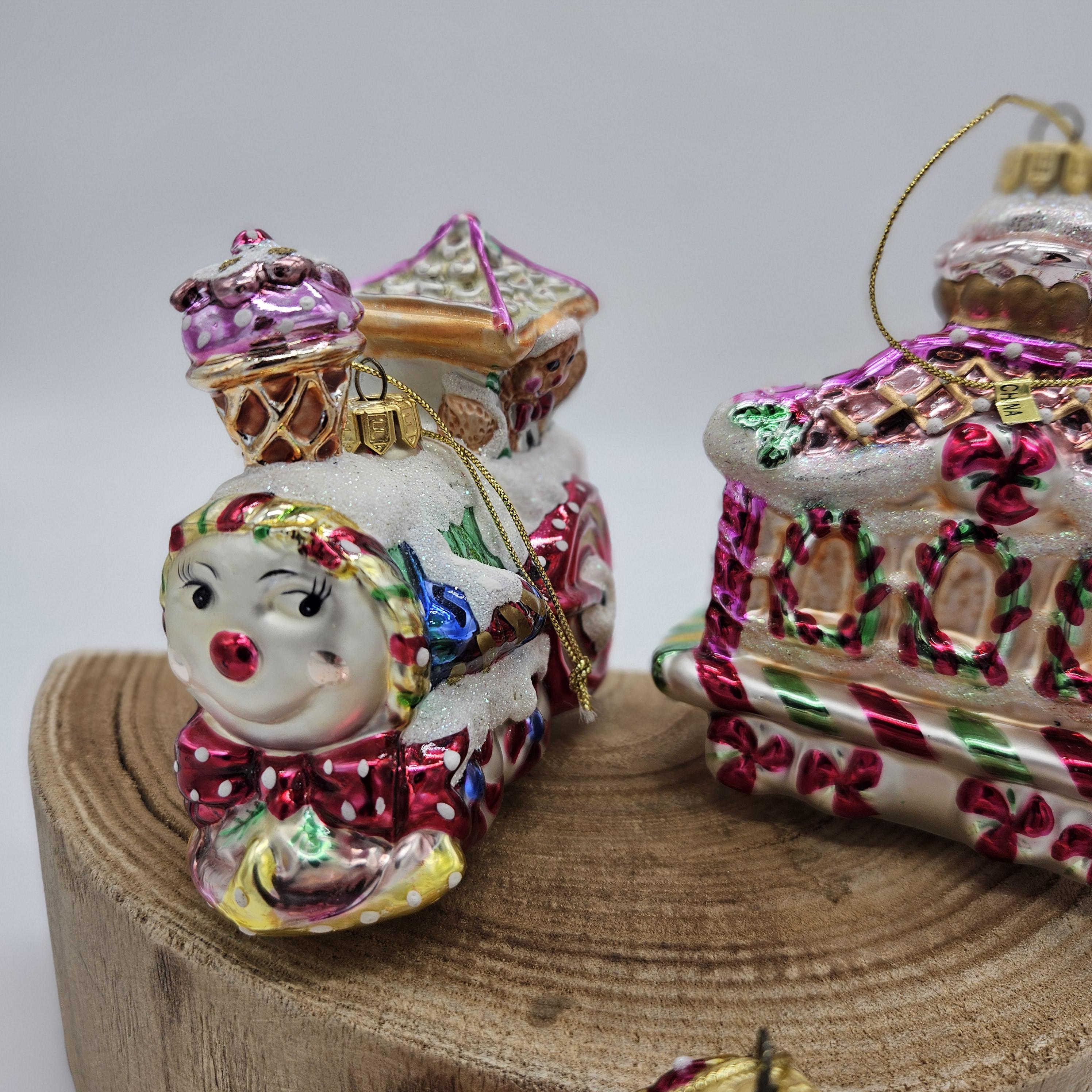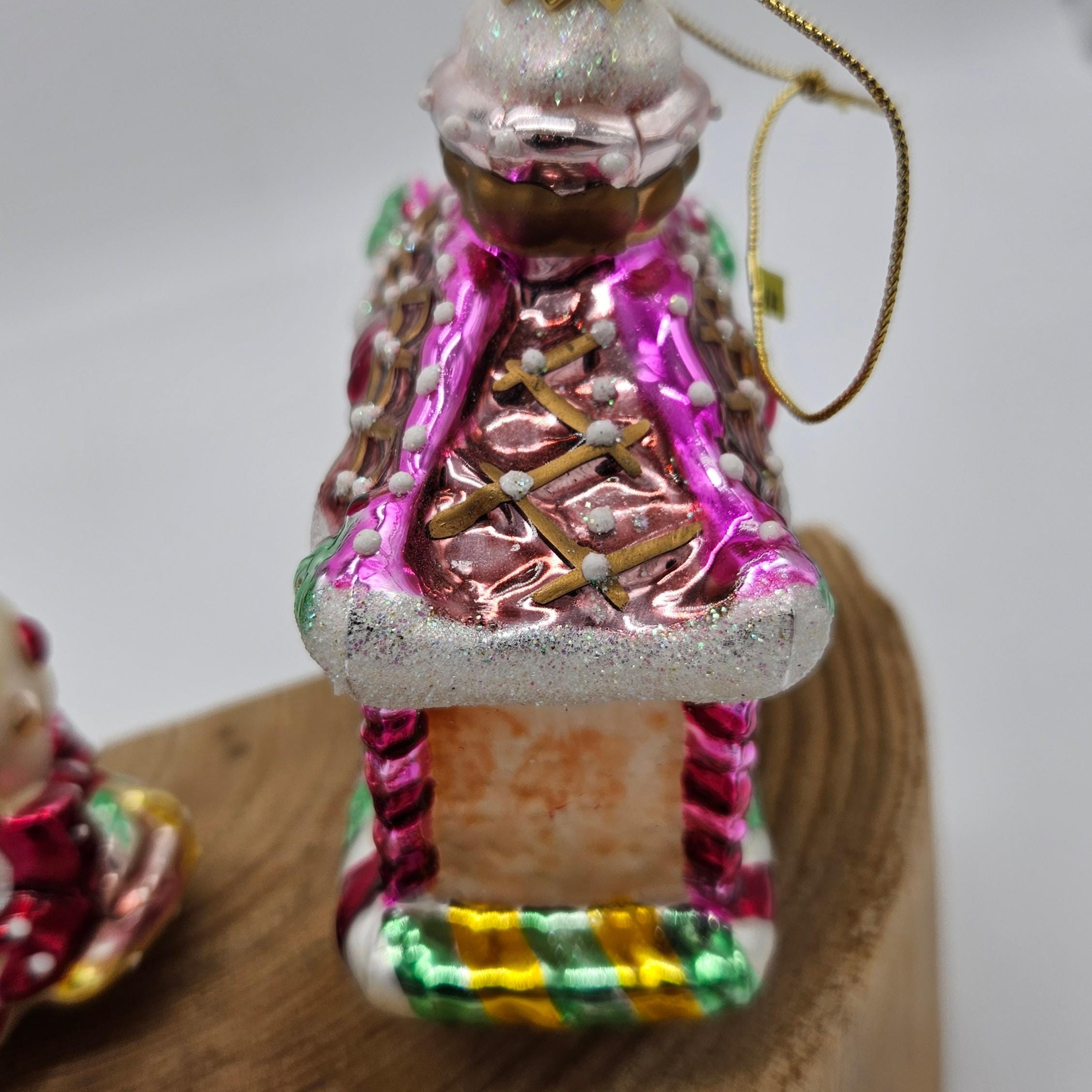 This set includes a gingerbread train with a cookie conductor, a decorated gingerbread house, and a charming bunny gingerbread house. Each ornament is hand-painted with bright metallic candy colors and glitter “snow” accents. The ornament caps are stamped Fitz & Floyd, confirming they are authentic pieces from the brand’s collectible holiday ornament lines. These ornaments are perfect for a gingerbread-themed Christmas tree, holiday village display, or whimsical seasonal decor.