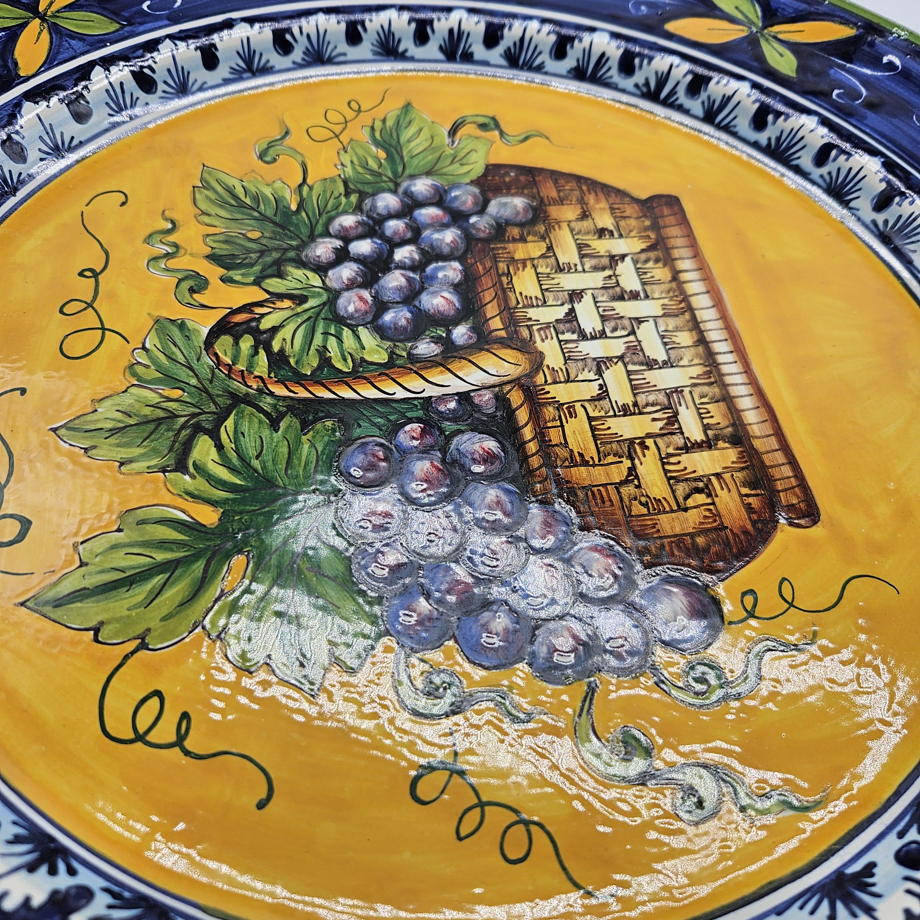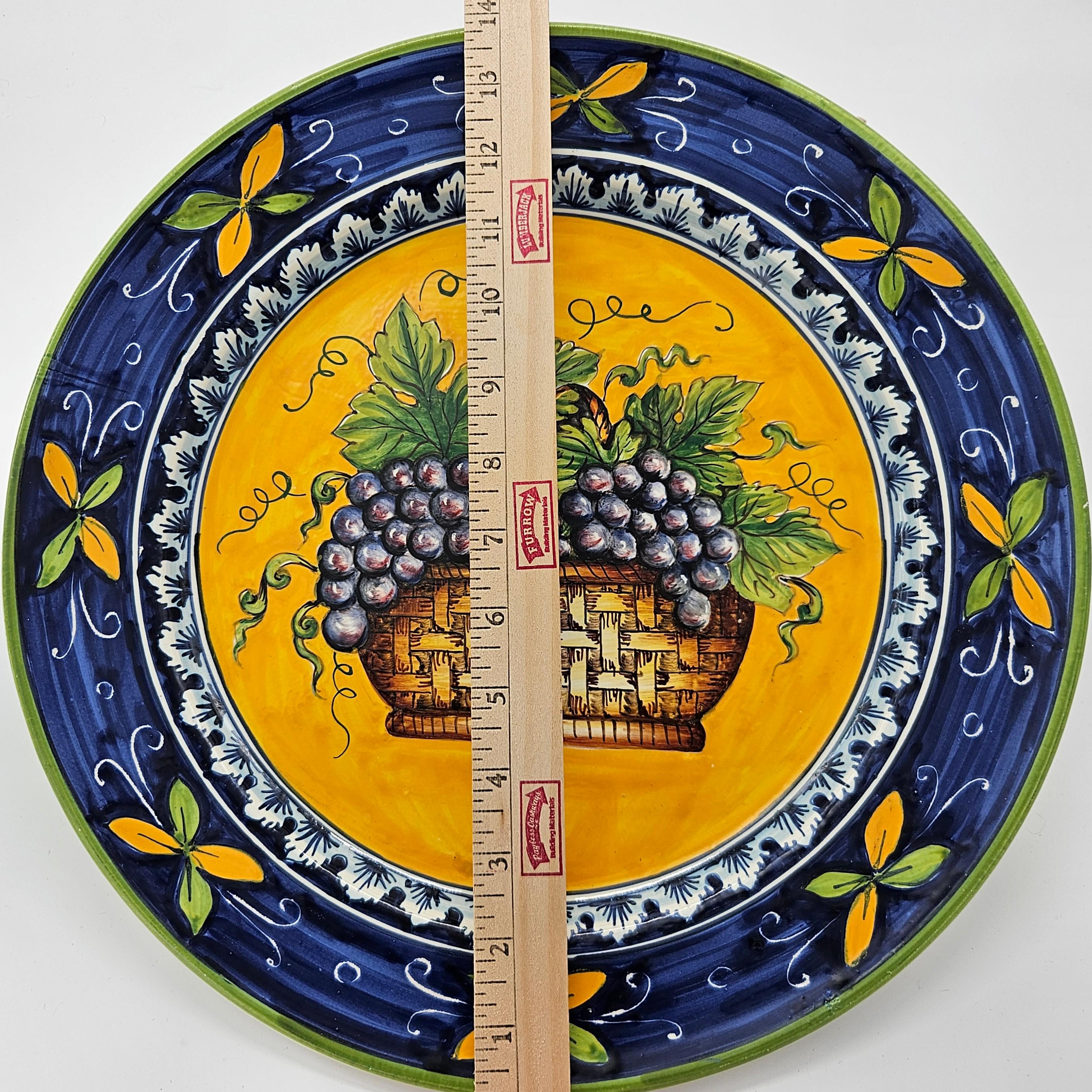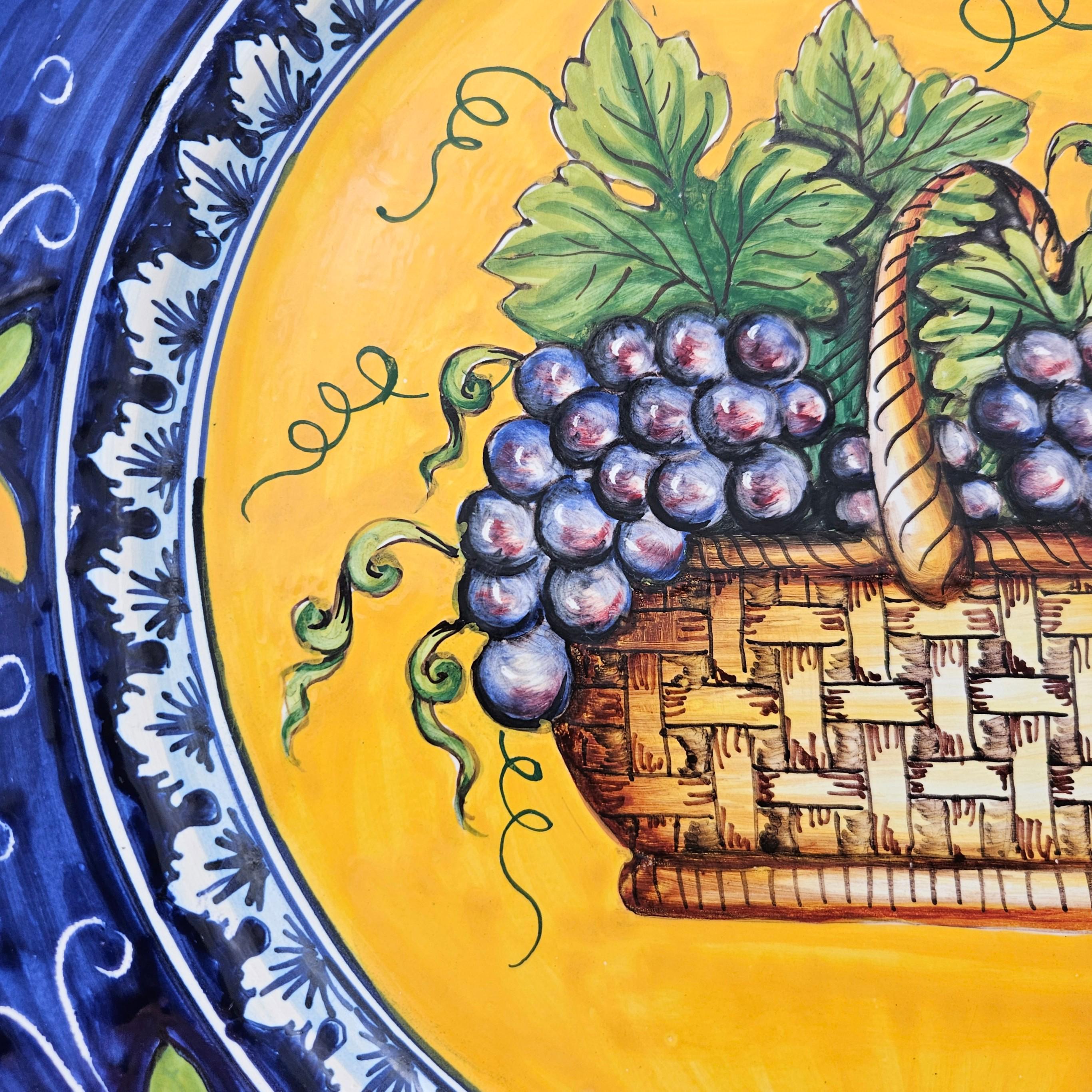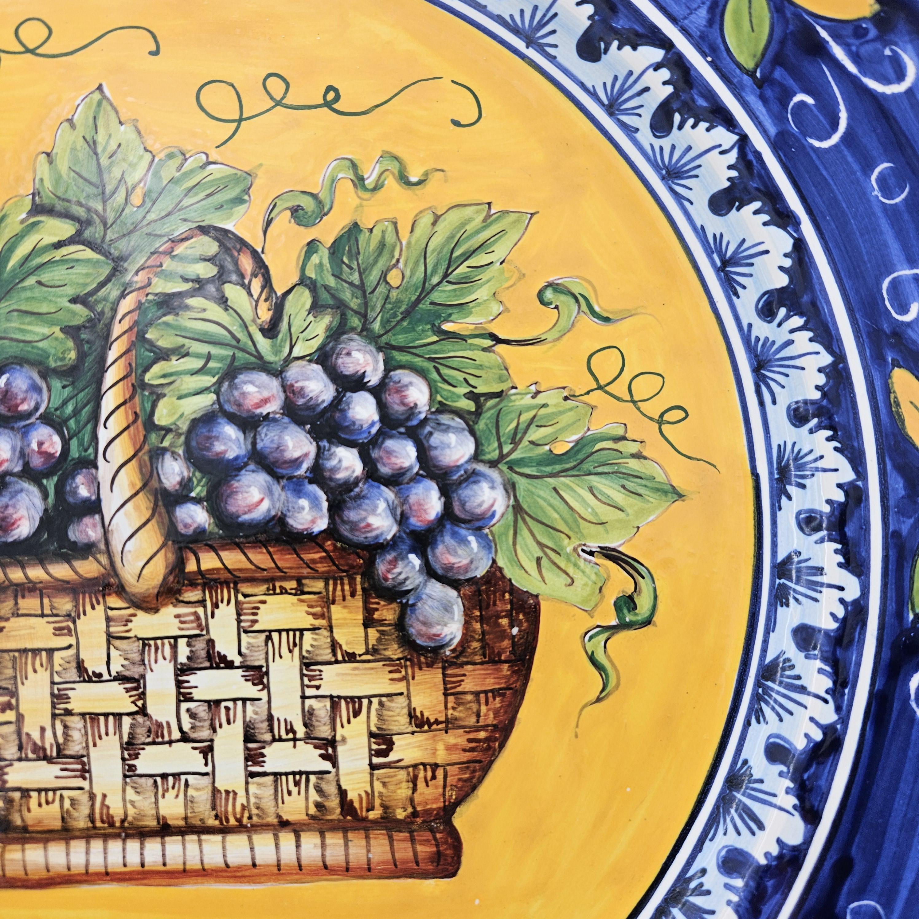 This beautiful hand painted Italian majolica wall plate was made by Ceramiche Giacomini in Orvieto, Italy. The center features a woven basket overflowing with grapes and vine leaves. The colors on this piece are amazing, deep blues, bright yellow, and rich purple grapes with handpainted highlights. The brushwork in the grapes and basket really shows the handmade quality. It measures about 14 inches in diameter, making it a great size for wall display in a kitchen, dining room, or wine nook. There's a hanger already attached on the back so it’s ready to hang.