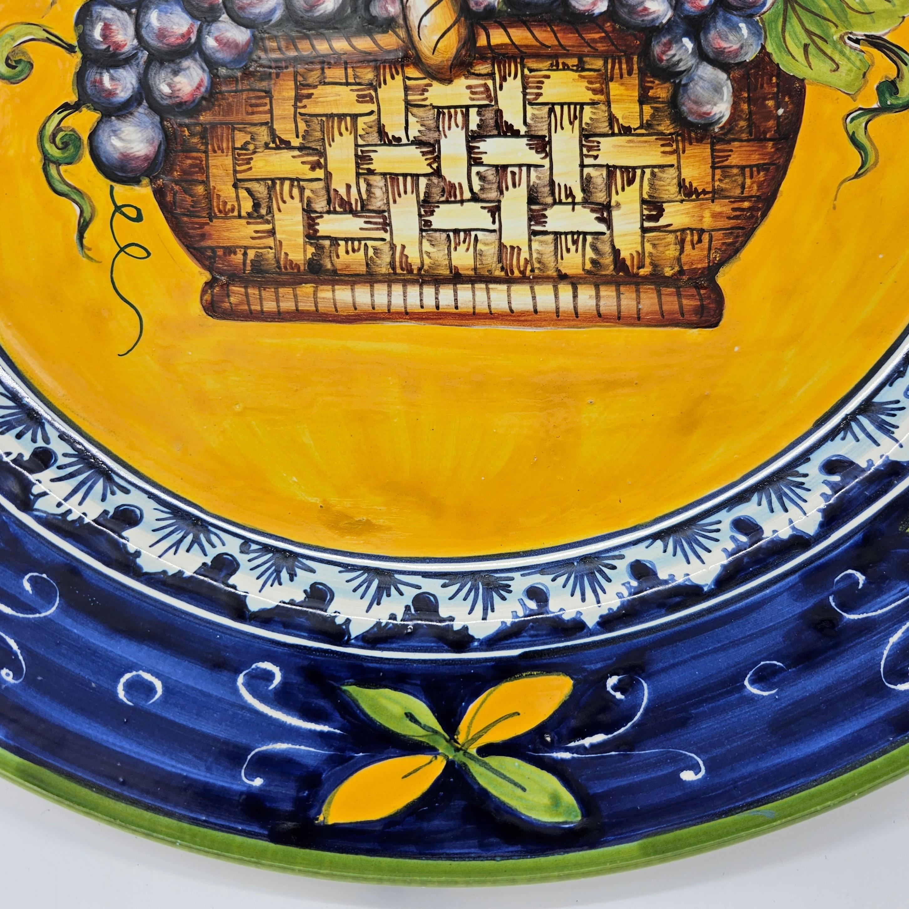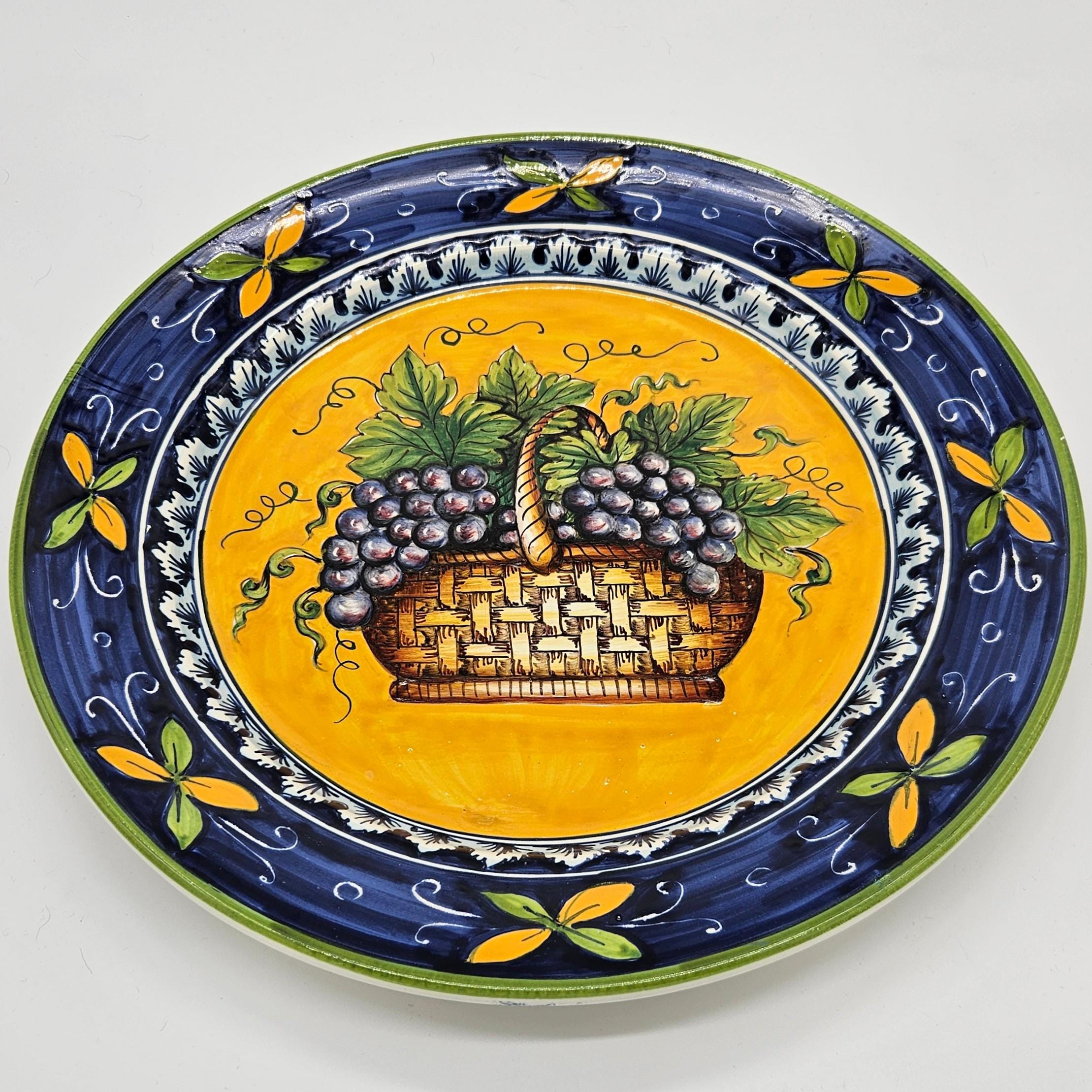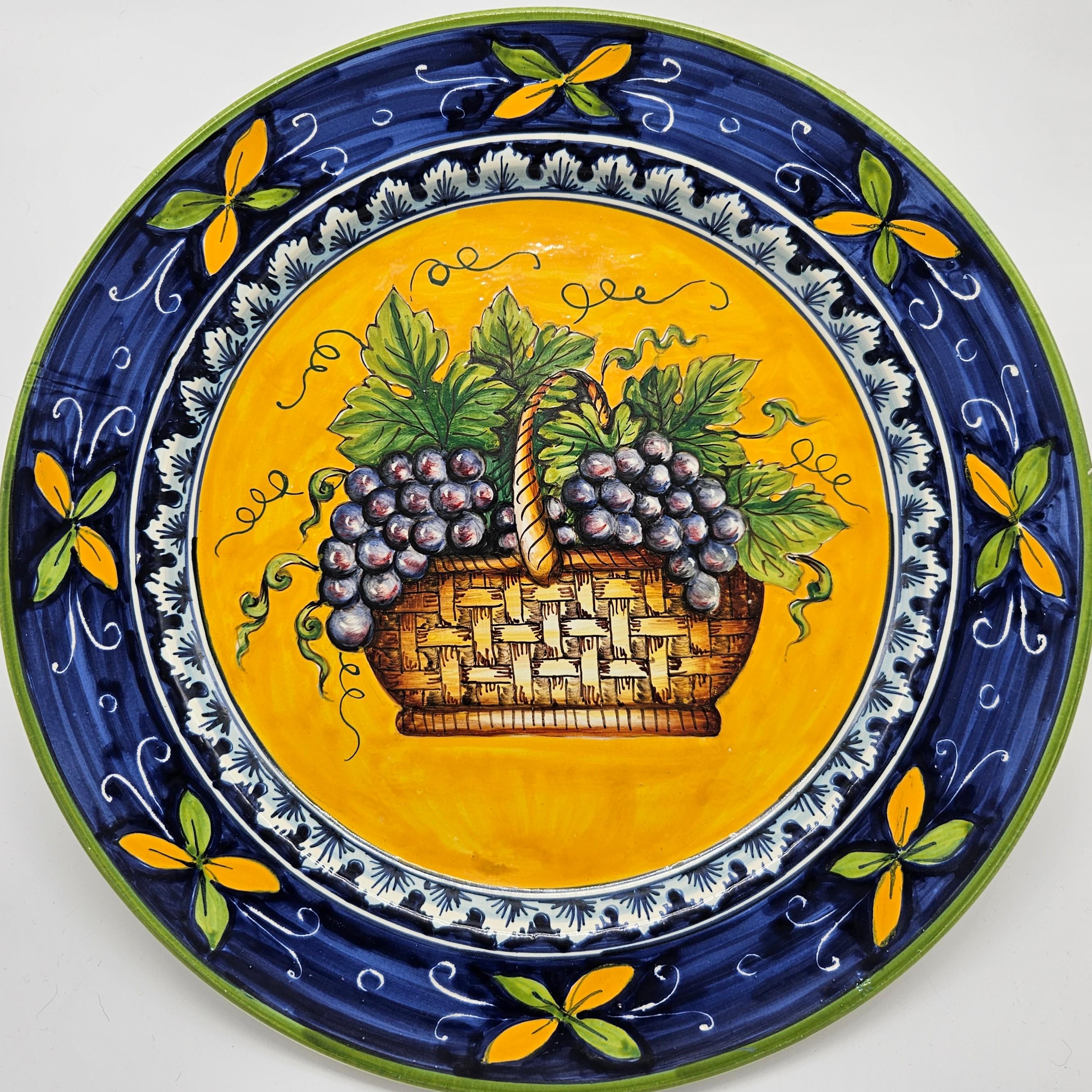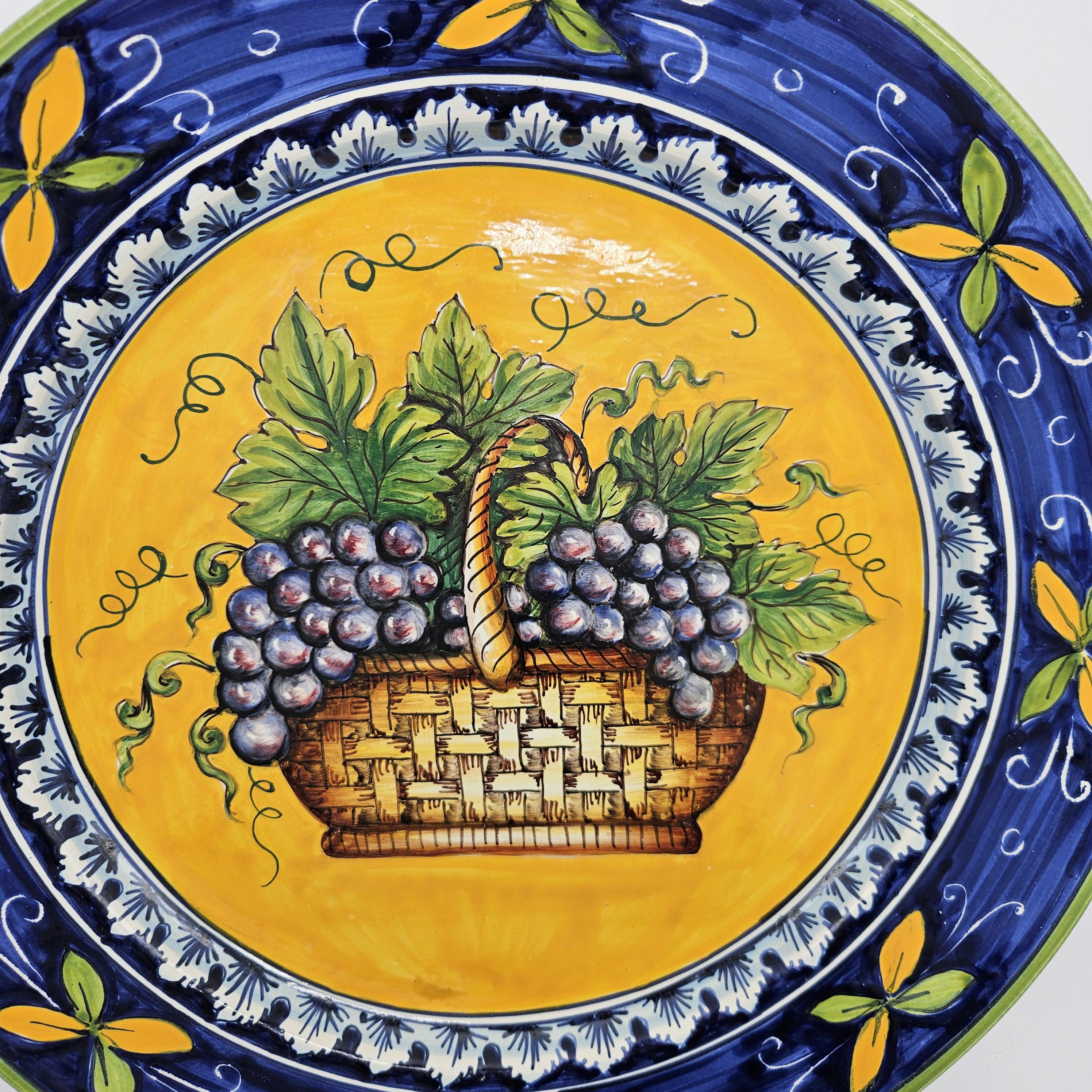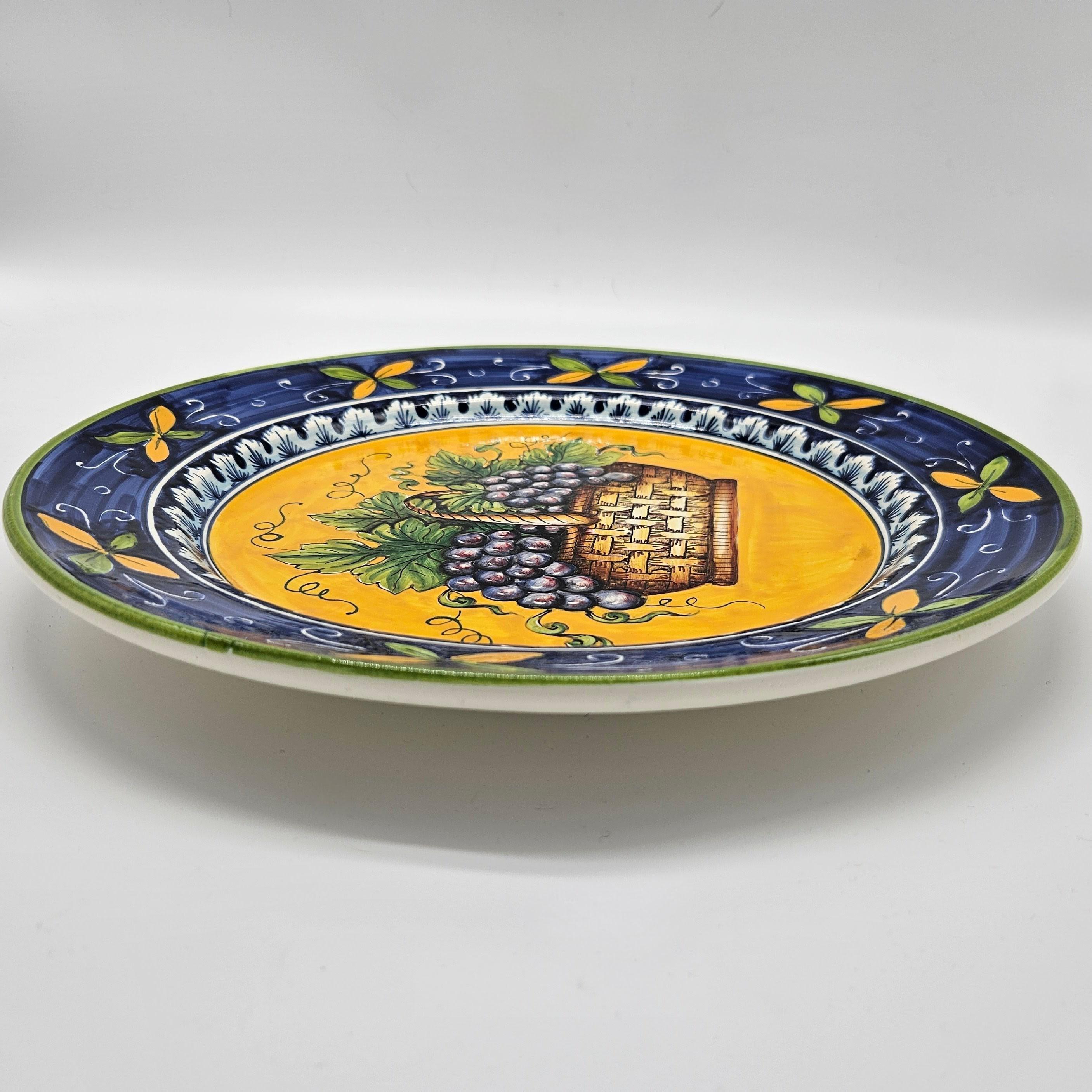 This beautiful hand painted Italian majolica wall plate was made by Ceramiche Giacomini in Orvieto, Italy. The center features a woven basket overflowing with grapes and vine leaves. The colors on this piece are amazing, deep blues, bright yellow, and rich purple grapes with handpainted highlights. The brushwork in the grapes and basket really shows the handmade quality. It measures about 14 inches in diameter, making it a great size for wall display in a kitchen, dining room, or wine nook. There's a hanger already attached on the back so it’s ready to hang.