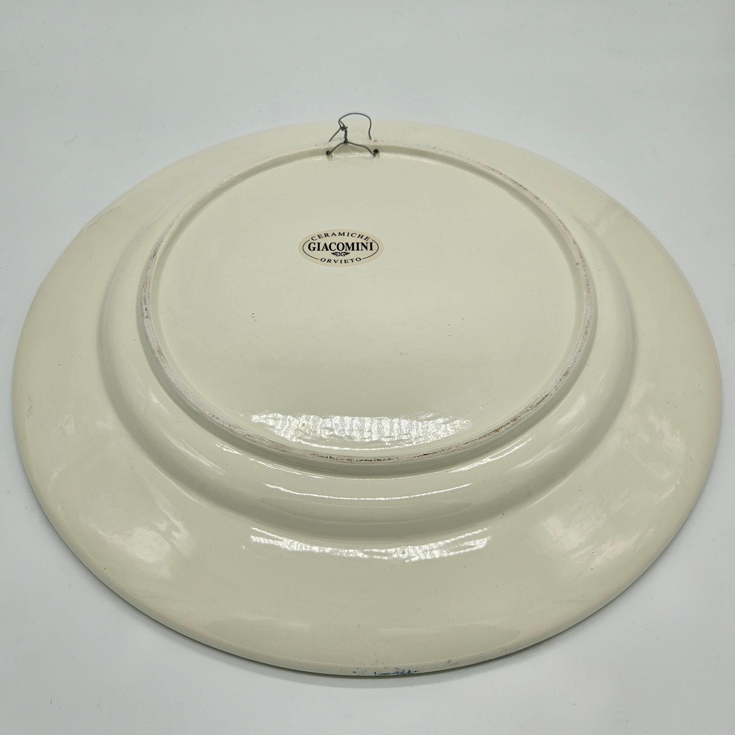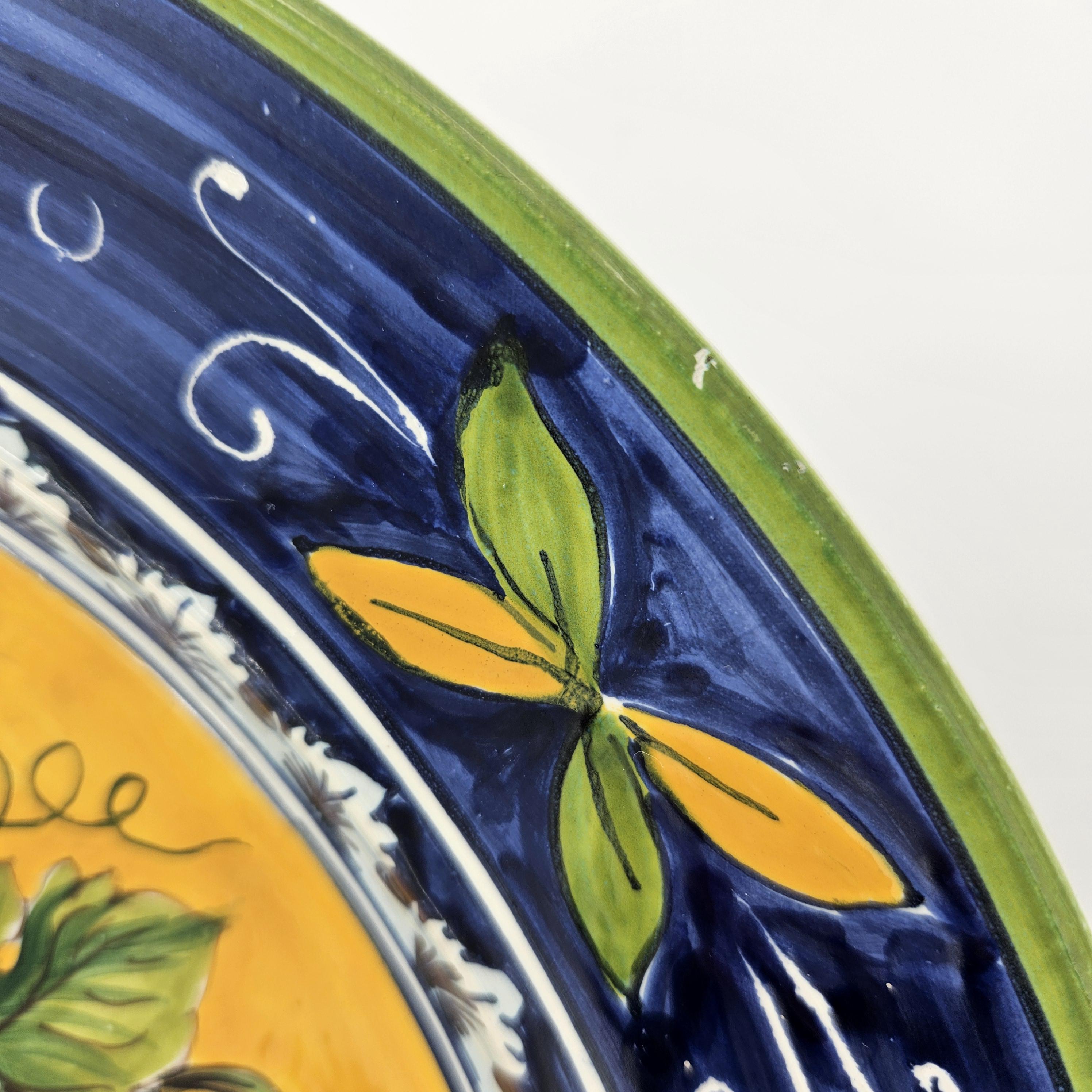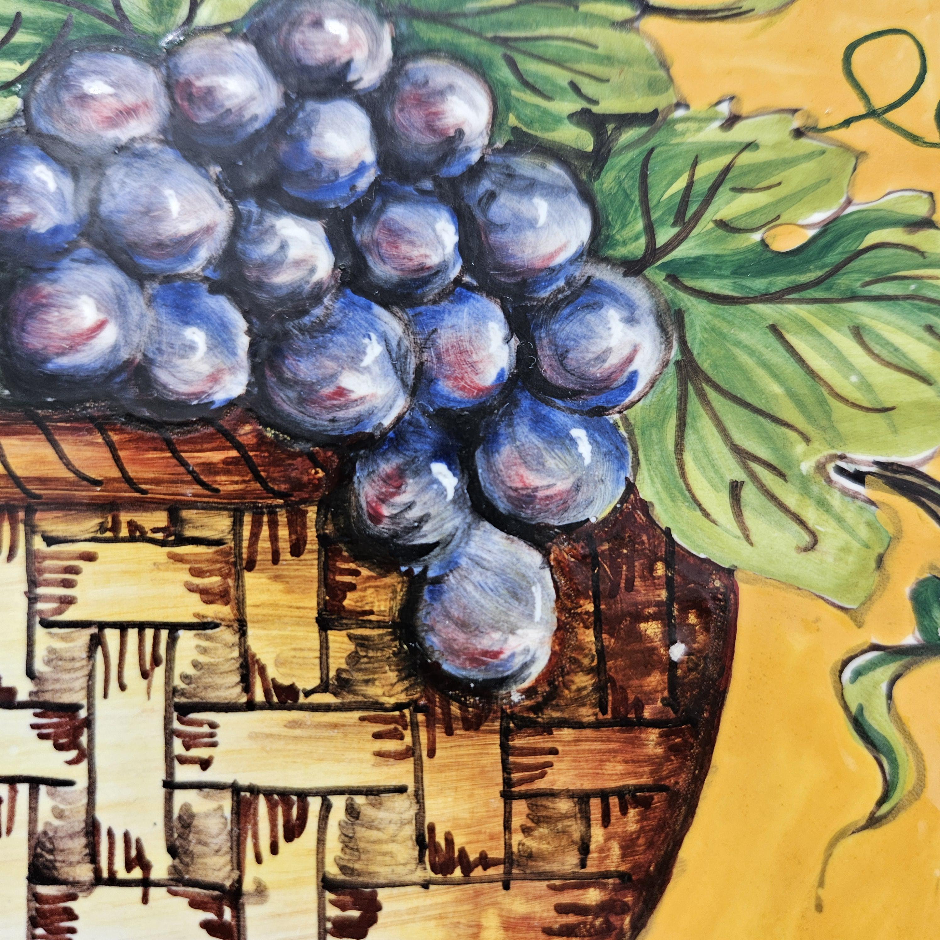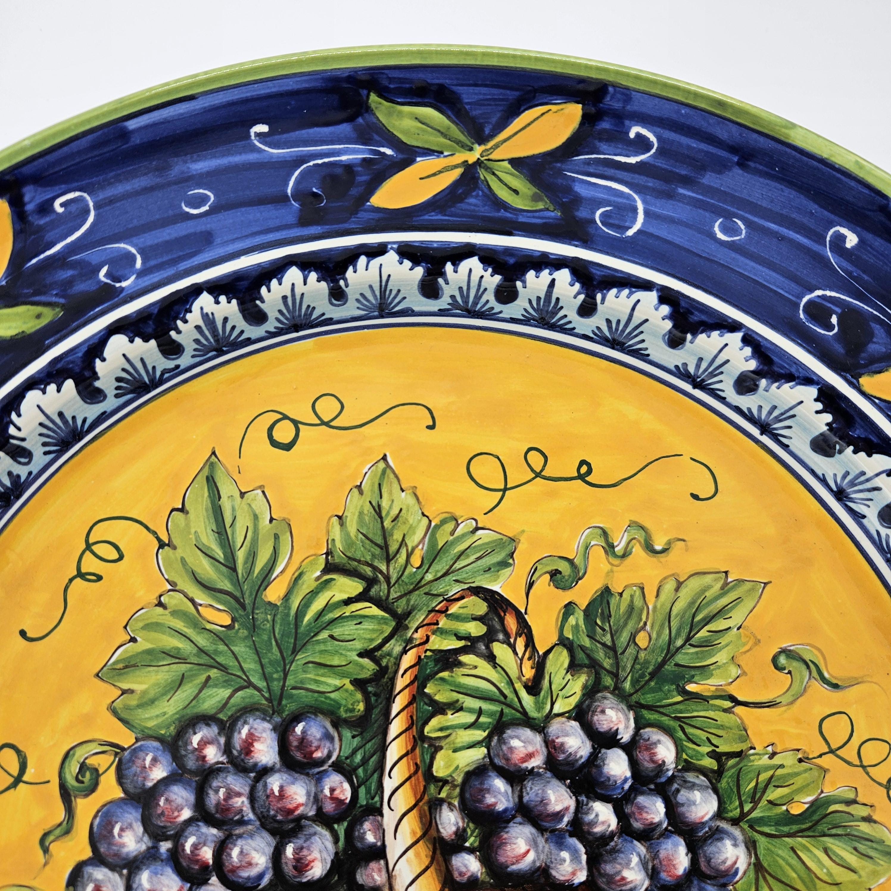 This beautiful hand painted Italian majolica wall plate was made by Ceramiche Giacomini in Orvieto, Italy. The center features a woven basket overflowing with grapes and vine leaves. The colors on this piece are amazing, deep blues, bright yellow, and rich purple grapes with handpainted highlights. The brushwork in the grapes and basket really shows the handmade quality. It measures about 14 inches in diameter, making it a great size for wall display in a kitchen, dining room, or wine nook. There's a hanger already attached on the back so it’s ready to hang.
