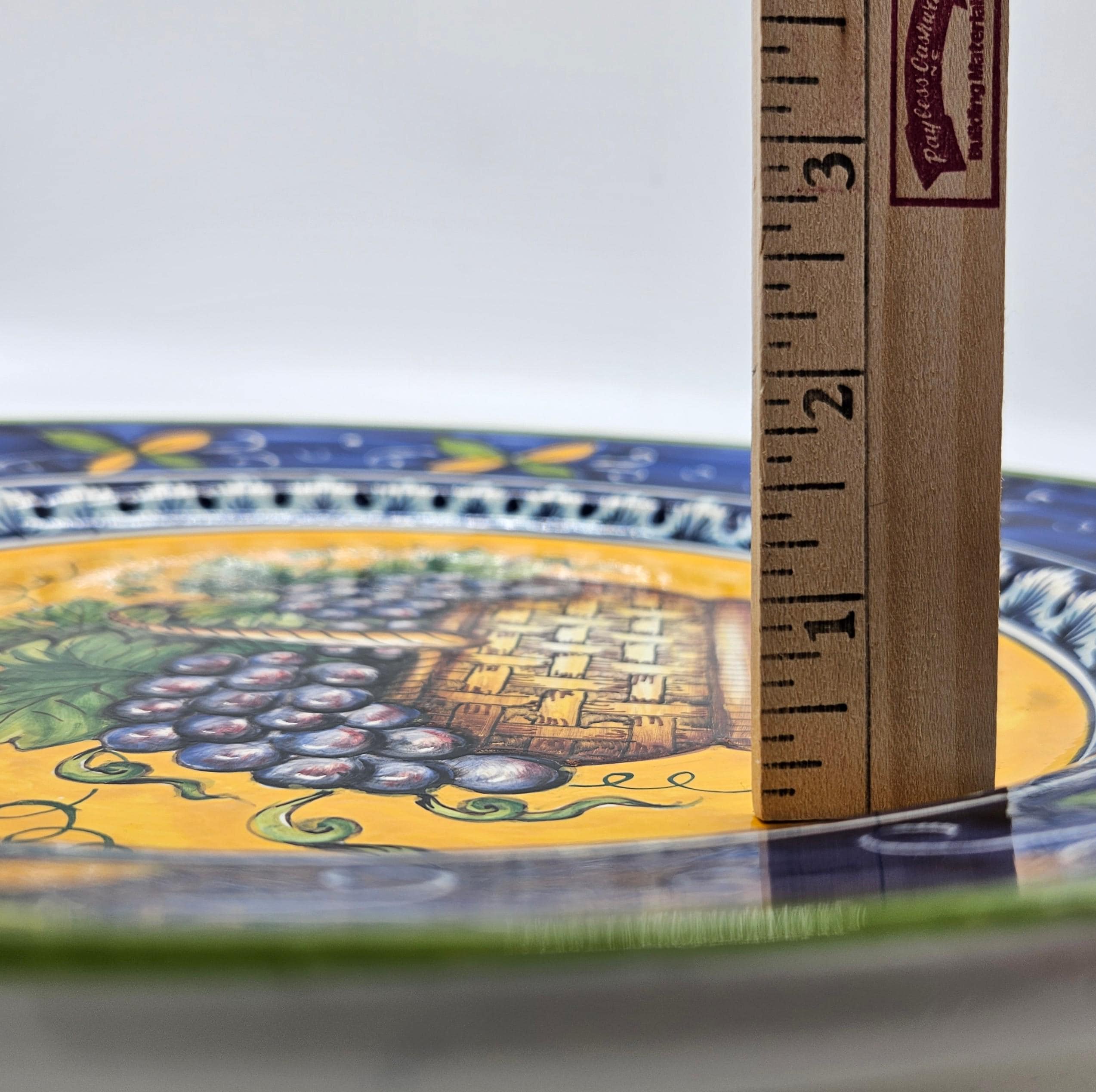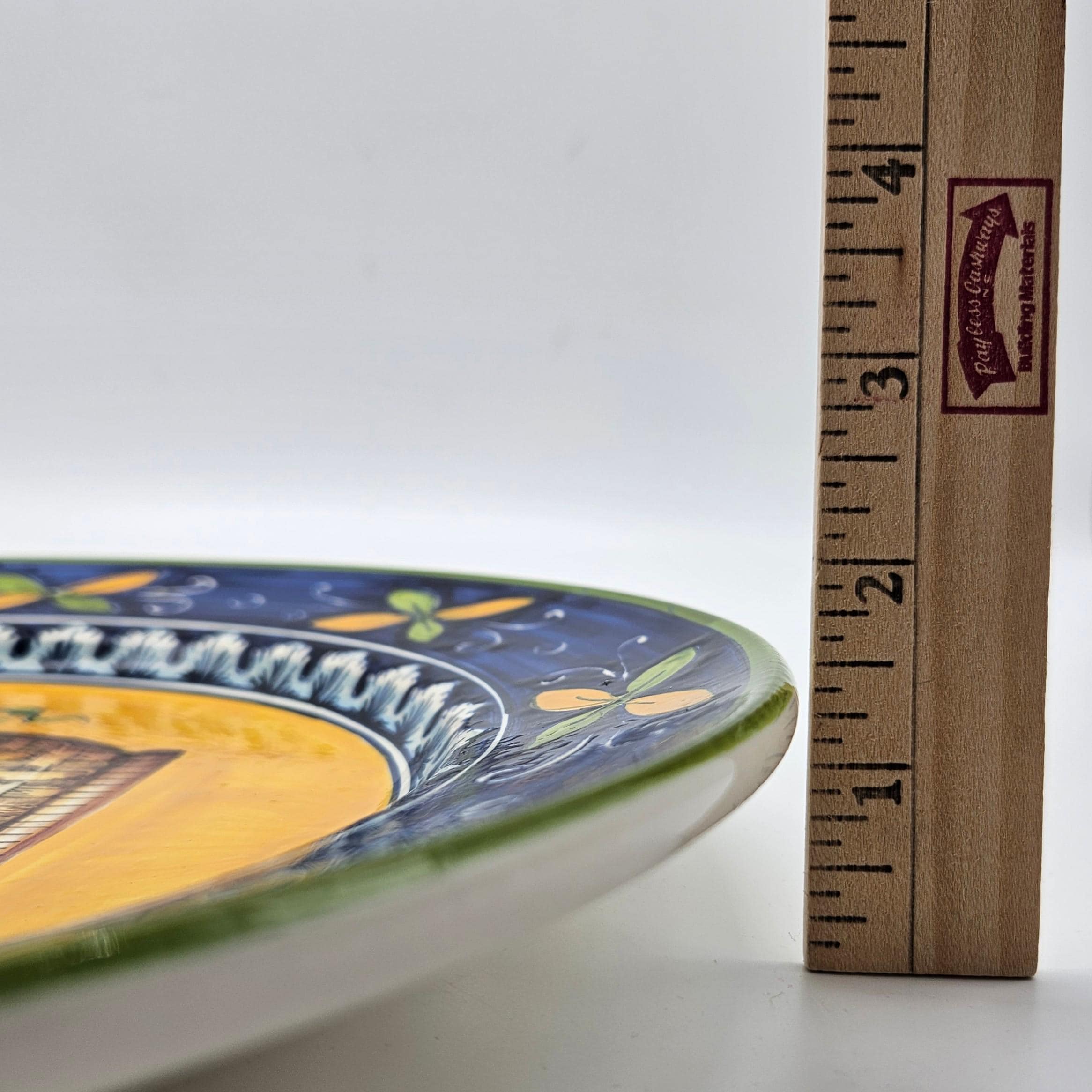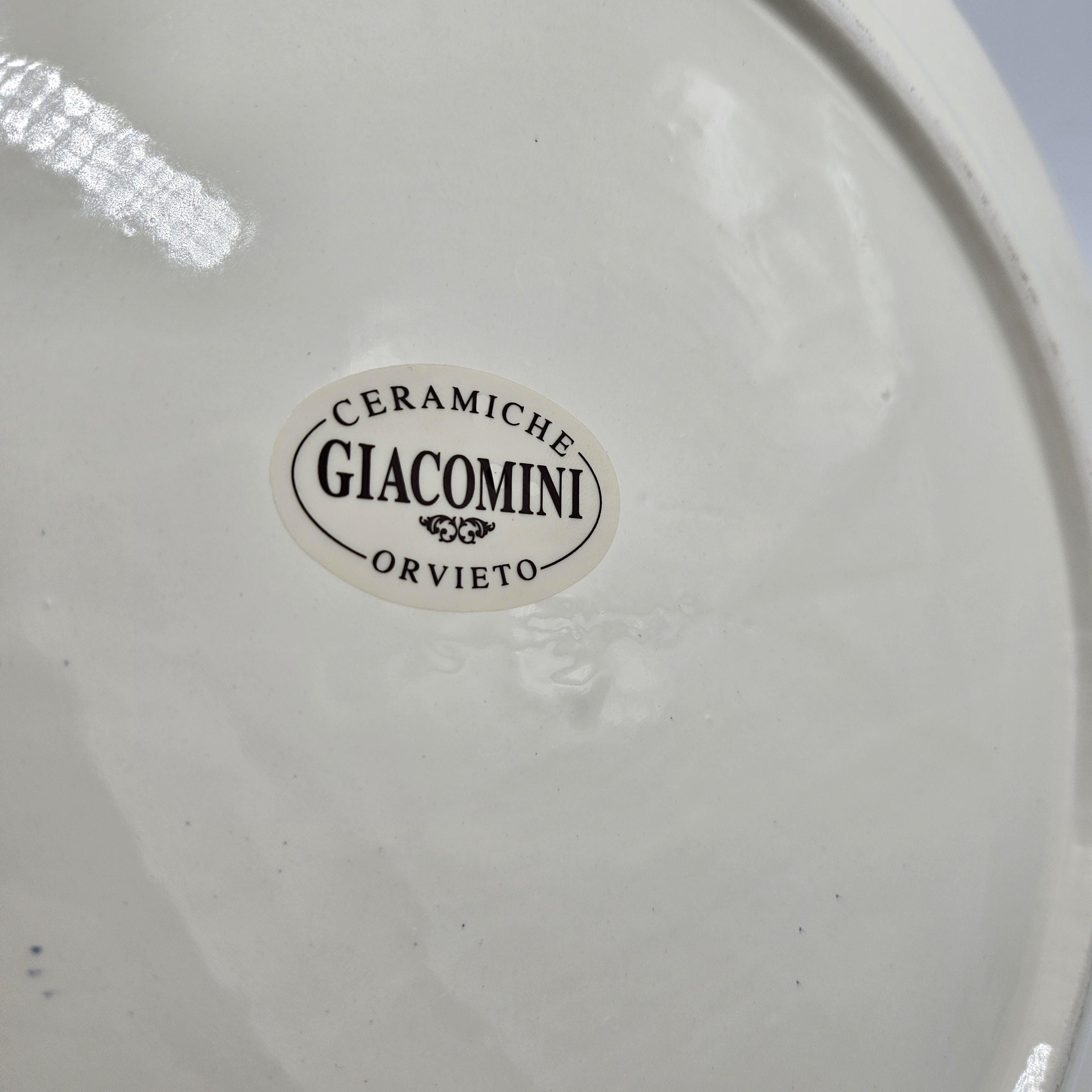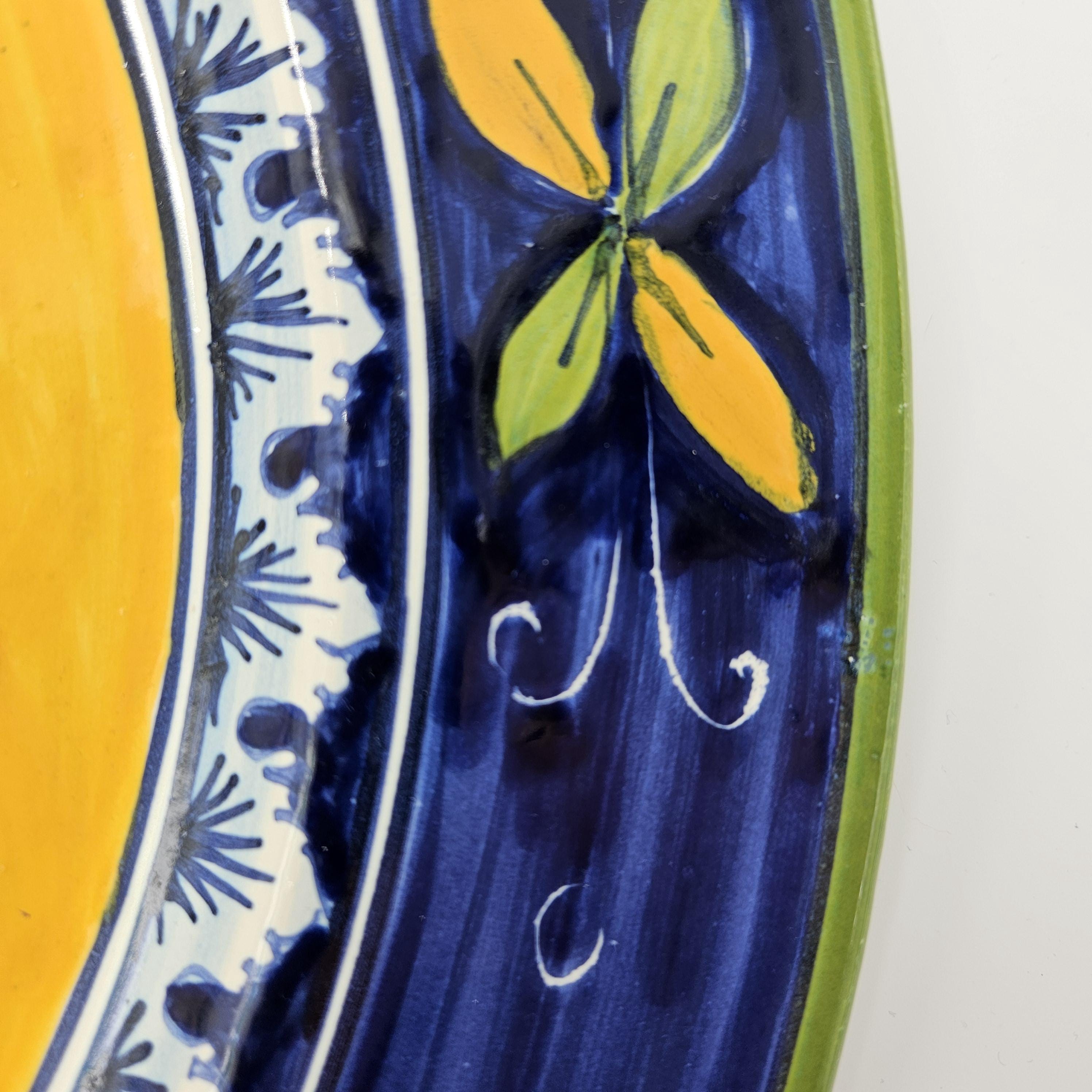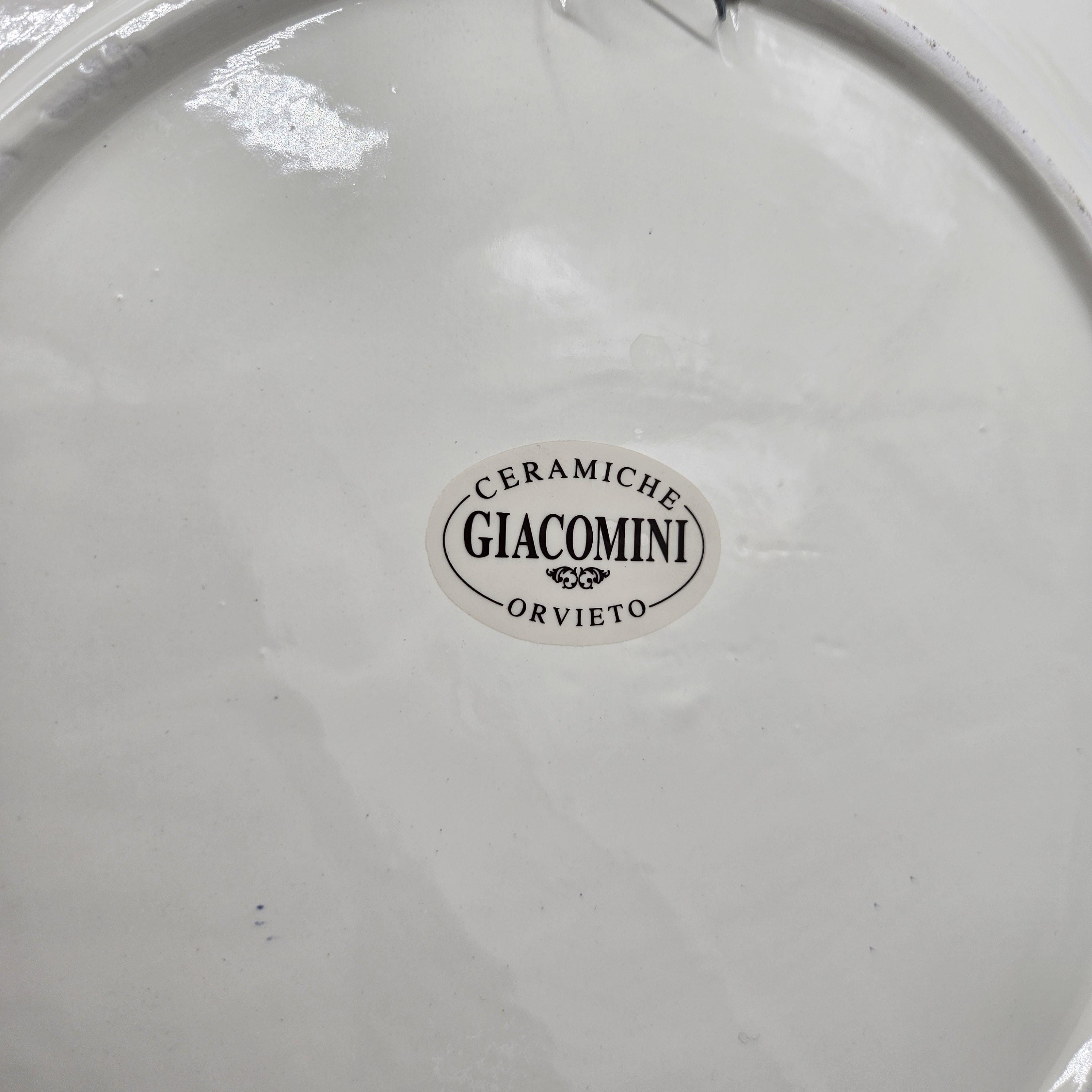 This beautiful hand painted Italian majolica wall plate was made by Ceramiche Giacomini in Orvieto, Italy. The center features a woven basket overflowing with grapes and vine leaves. The colors on this piece are amazing, deep blues, bright yellow, and rich purple grapes with handpainted highlights. The brushwork in the grapes and basket really shows the handmade quality. It measures about 14 inches in diameter, making it a great size for wall display in a kitchen, dining room, or wine nook. There's a hanger already attached on the back so it’s ready to hang.