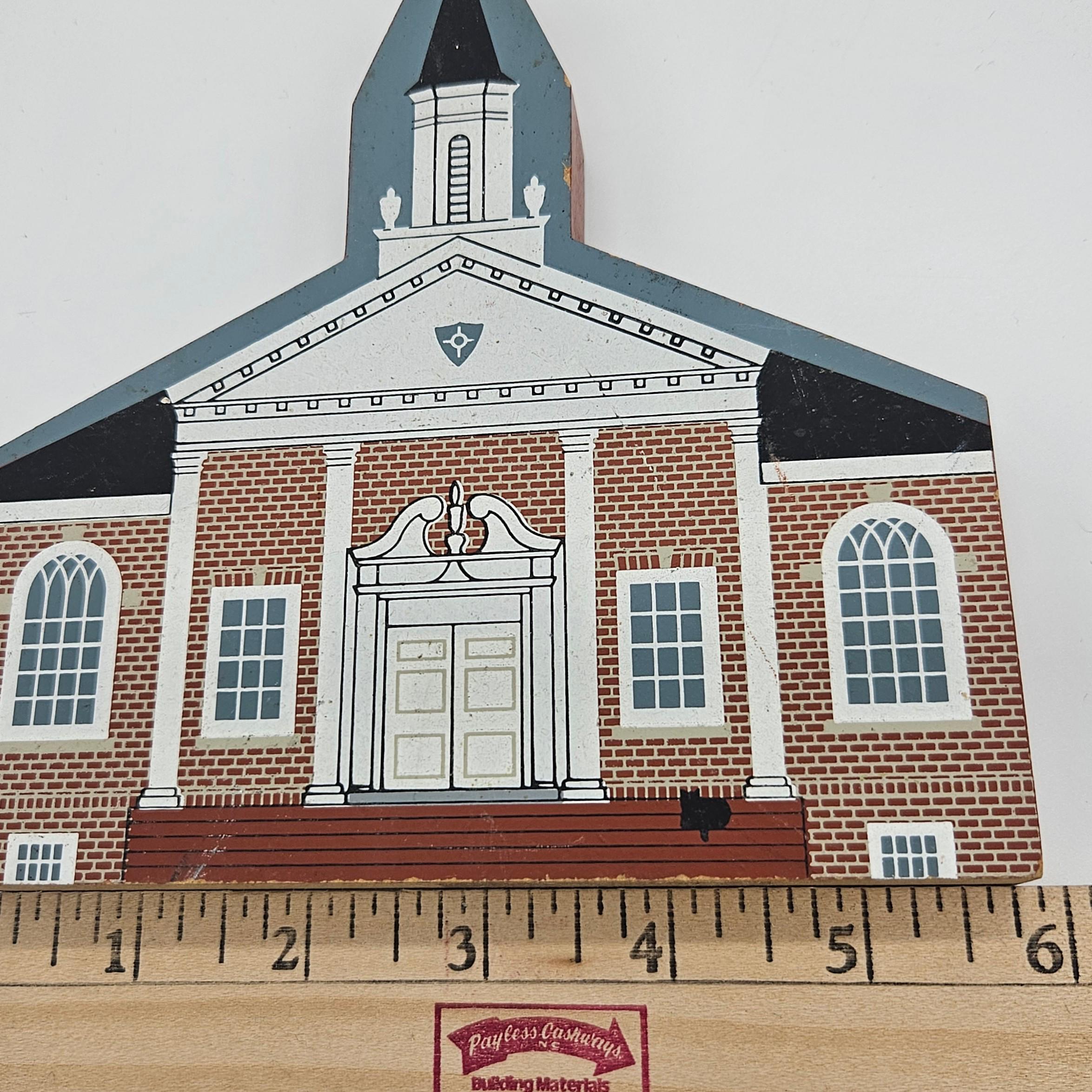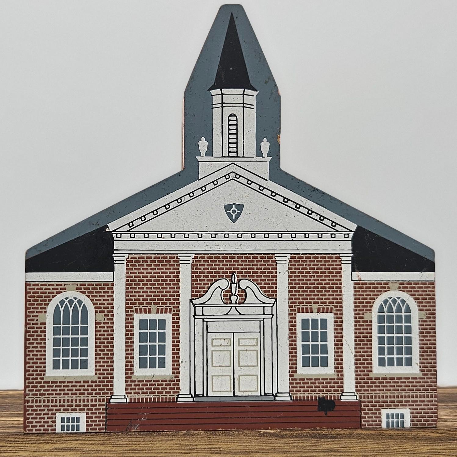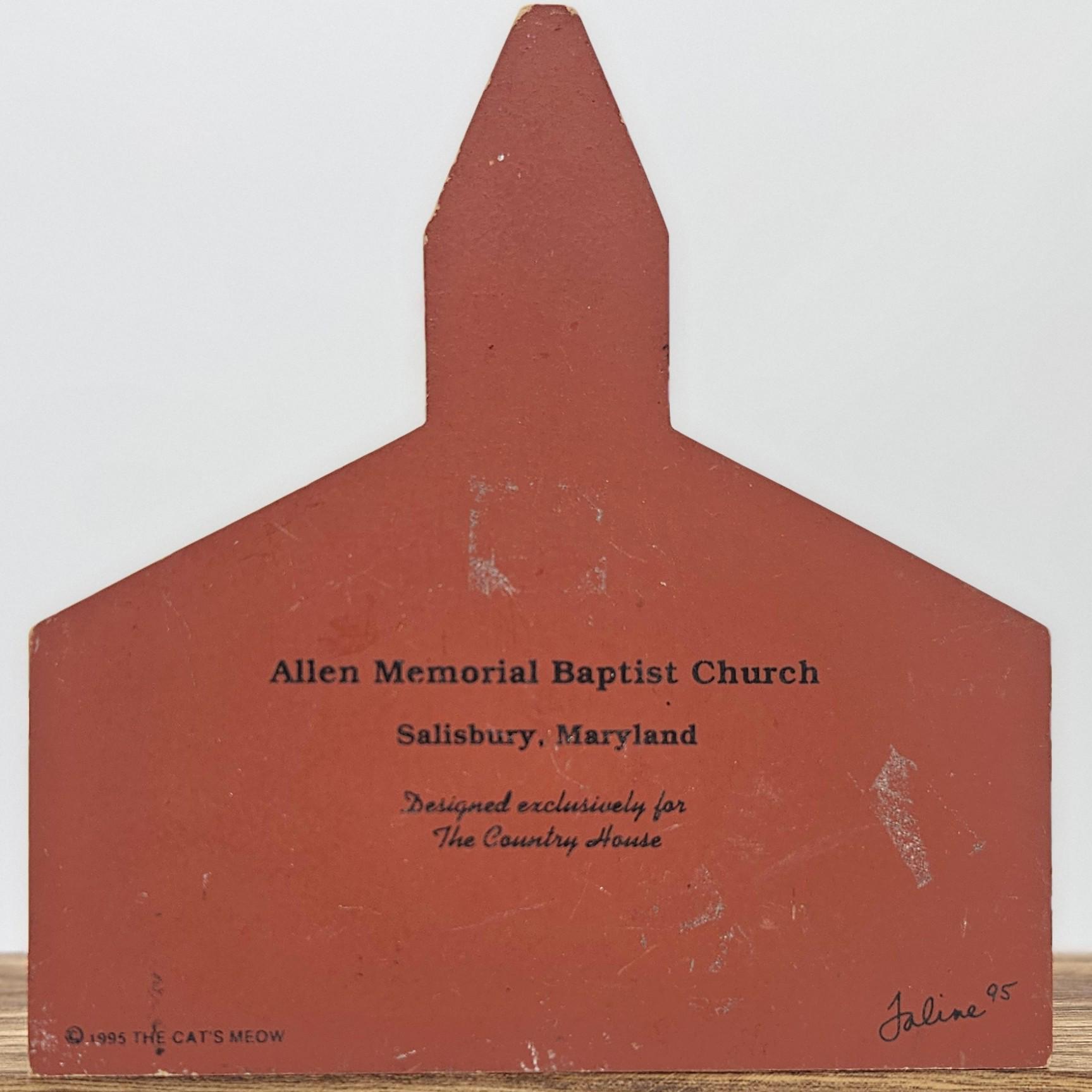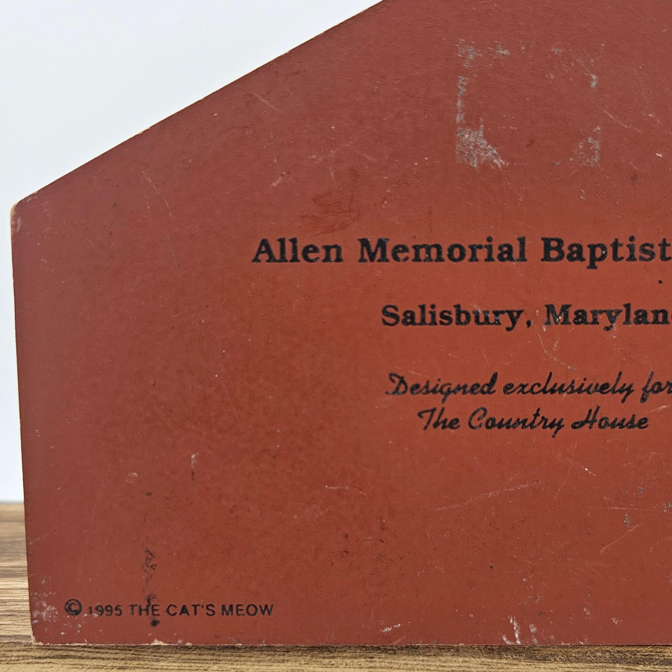 Vintage 1995 Cat’s Meow wooden shelf sitter featuring Allen Memorial Baptist Church in Salisbury, Maryland. Signed “Faline ’95” and marked © The Cat’s Meow. Designed exclusively for The Country House. A great addition for Cat’s Meow collectors or Maryland memorabilia displays.