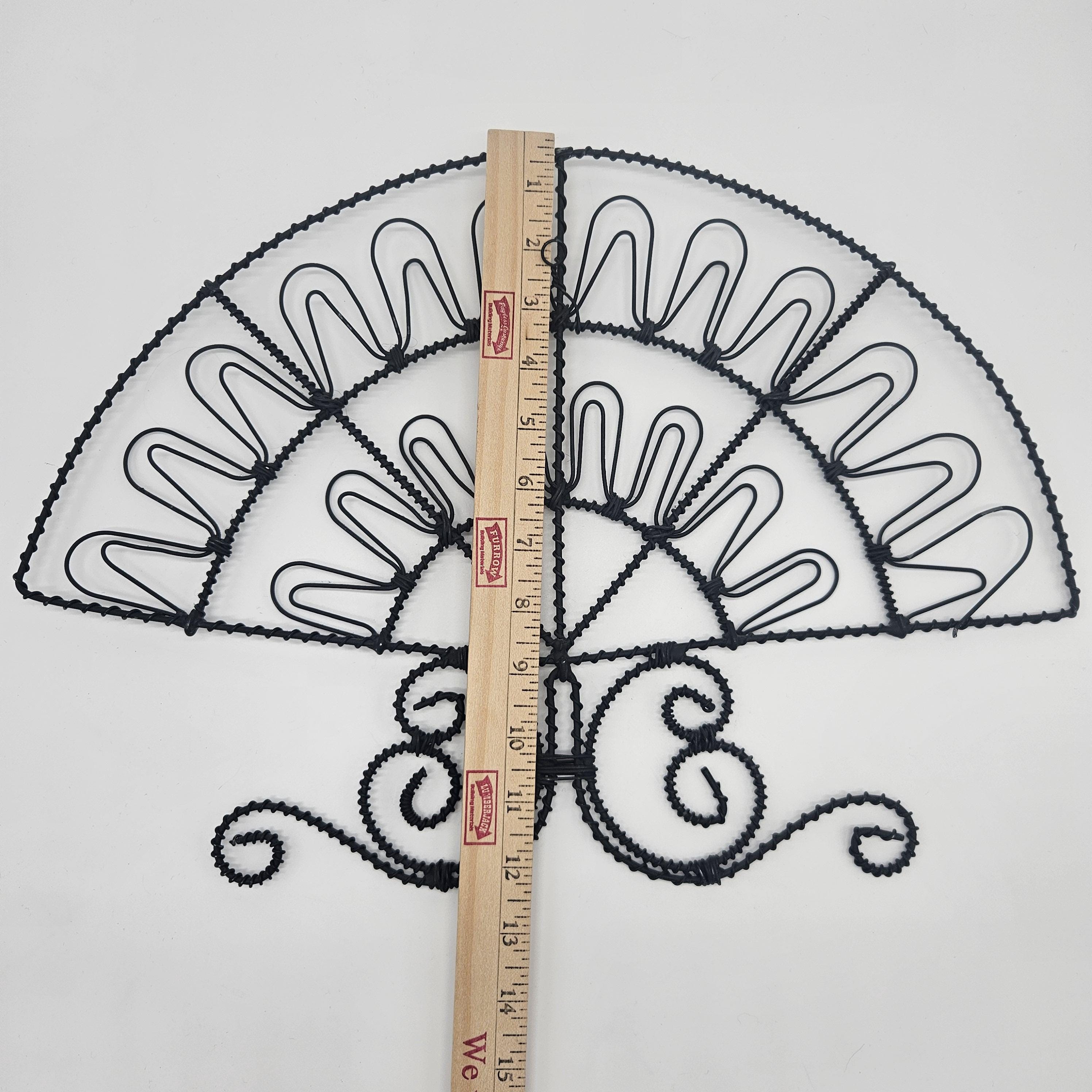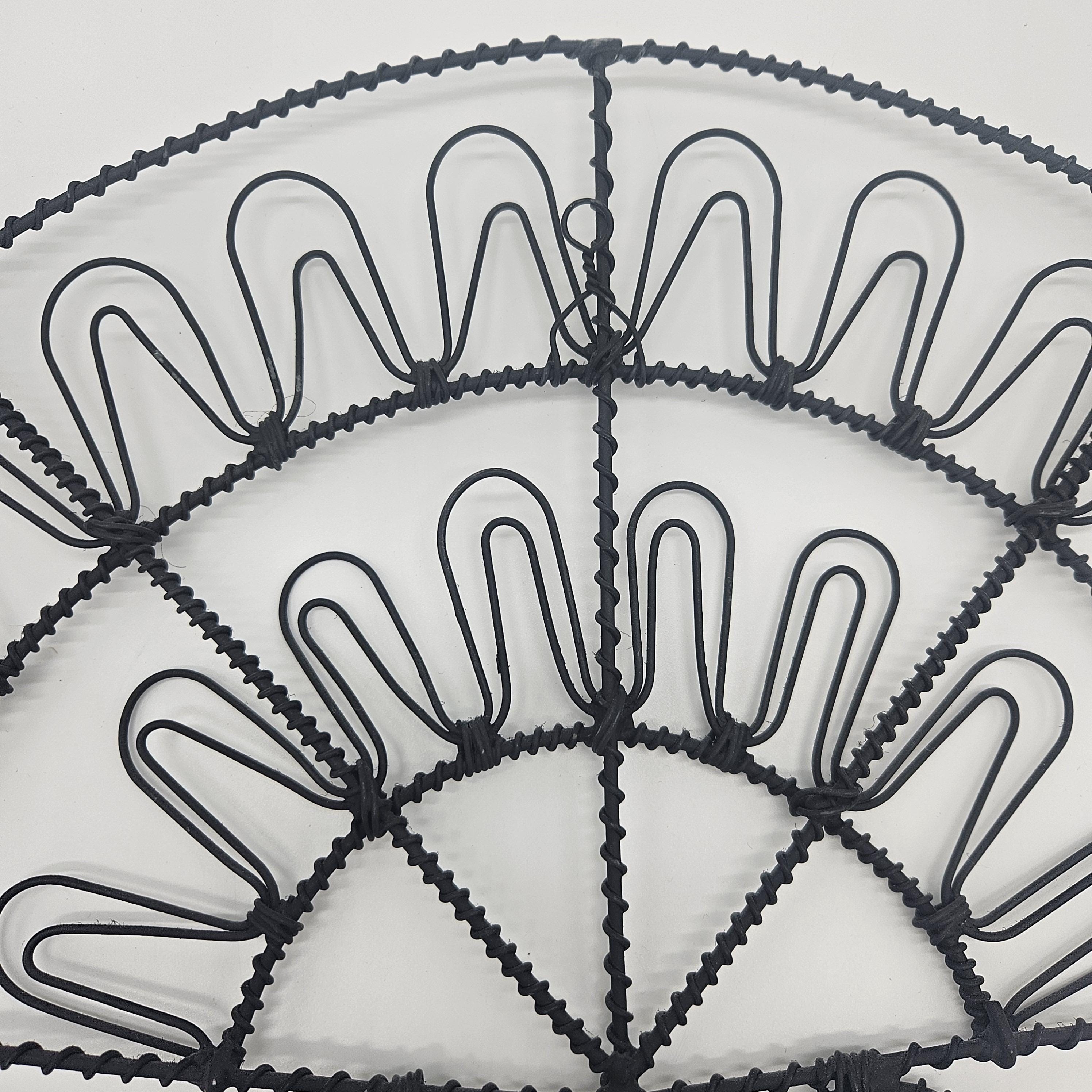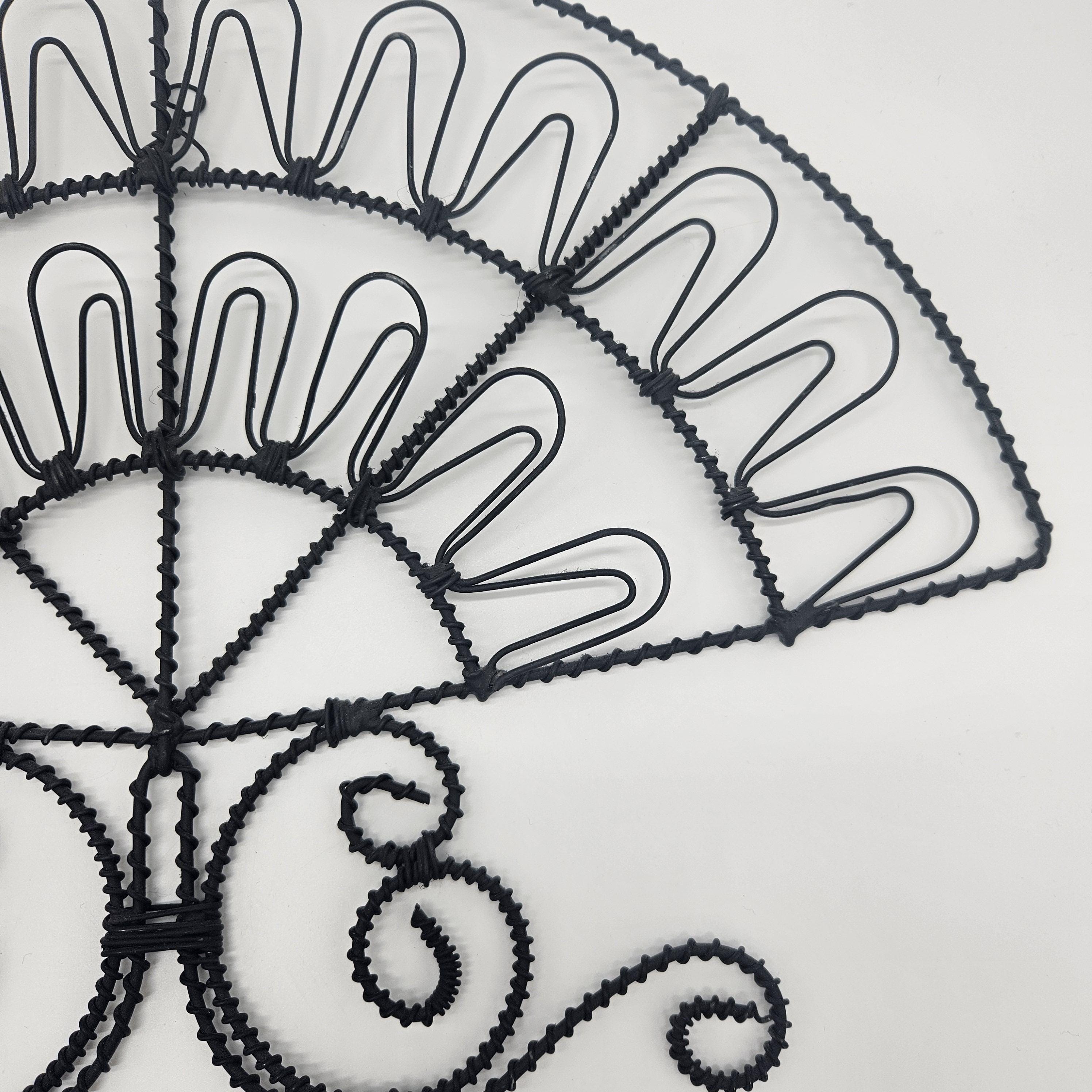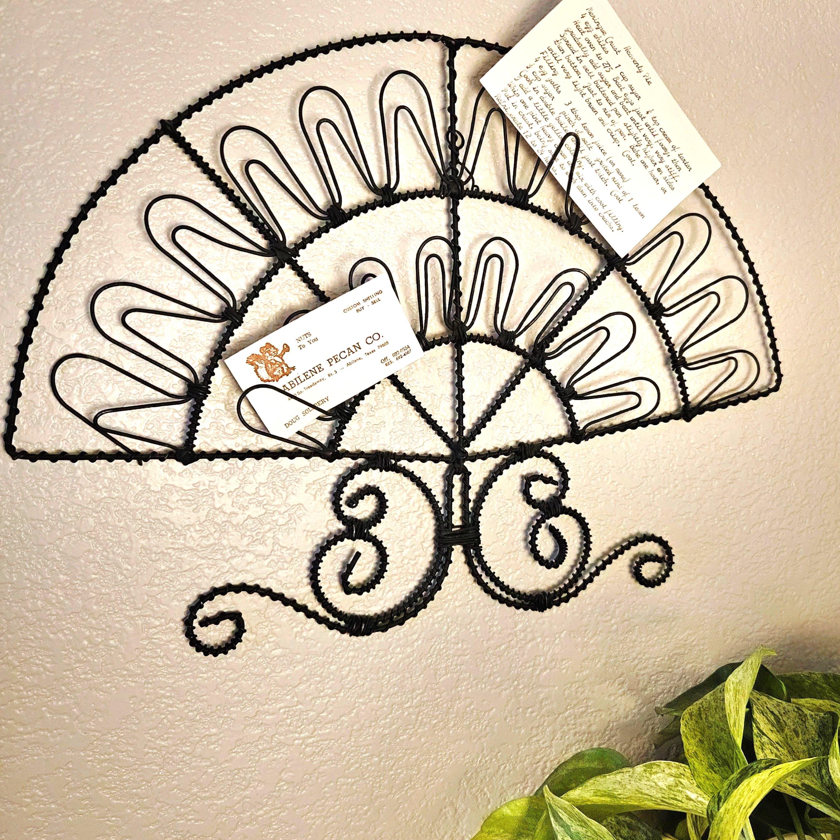 Vintage retro black wire wall mail holder or card display with a unique fan design and scroll base. Perfect for holding mail, greeting cards, recipes, notes, or small papers while adding a bit of retro charm to your wall. Looks great styled in a kitchen, entryway, or home office. Paper items not included.