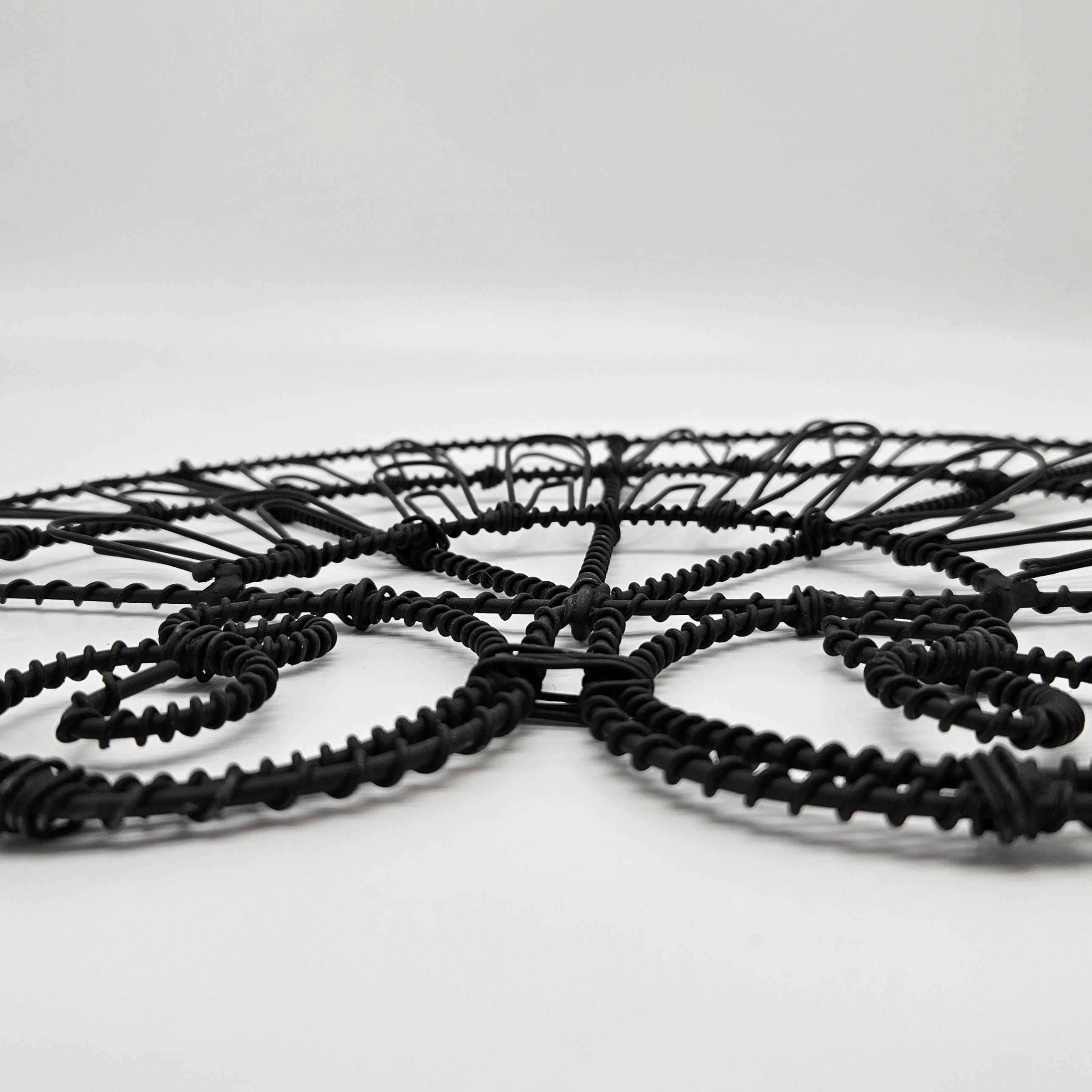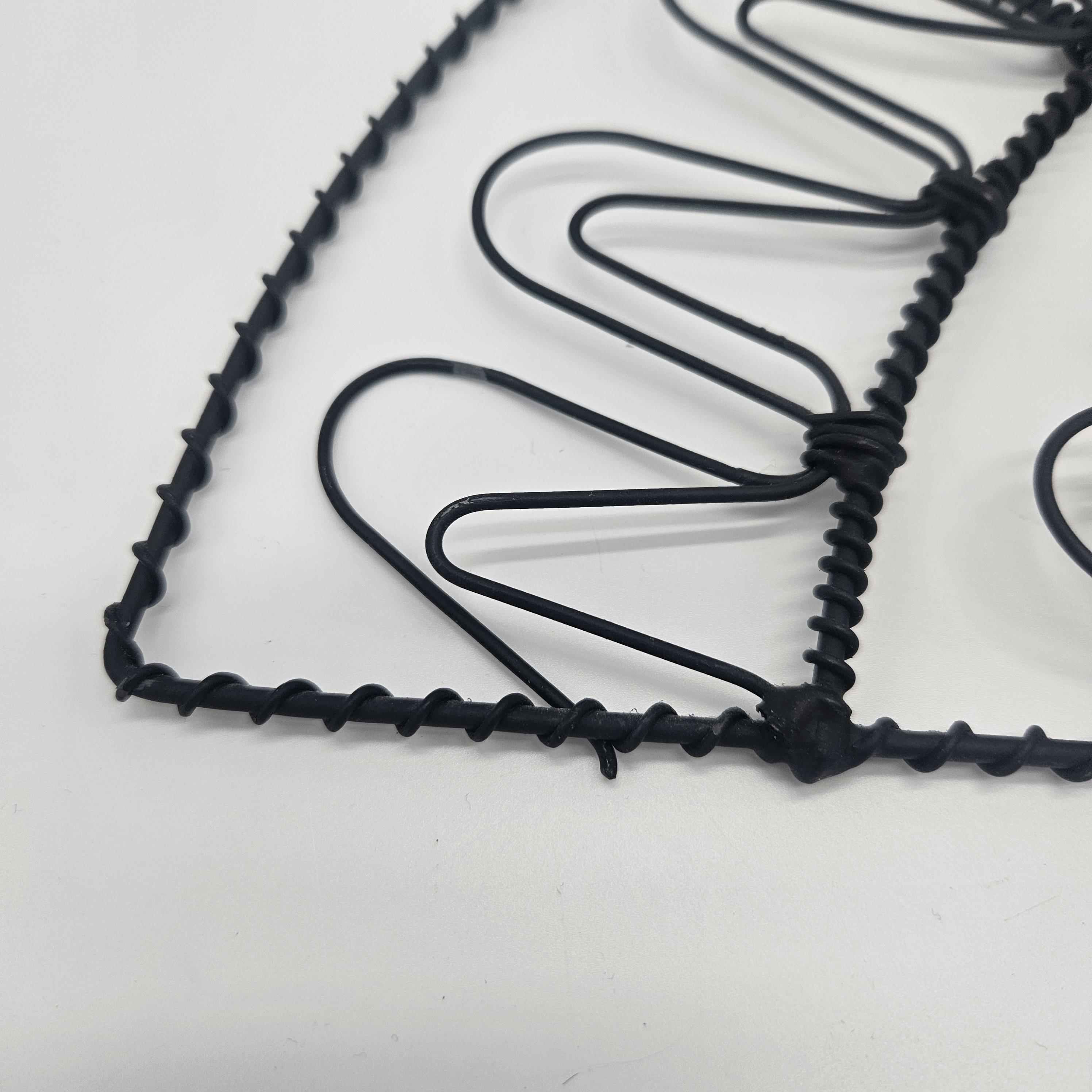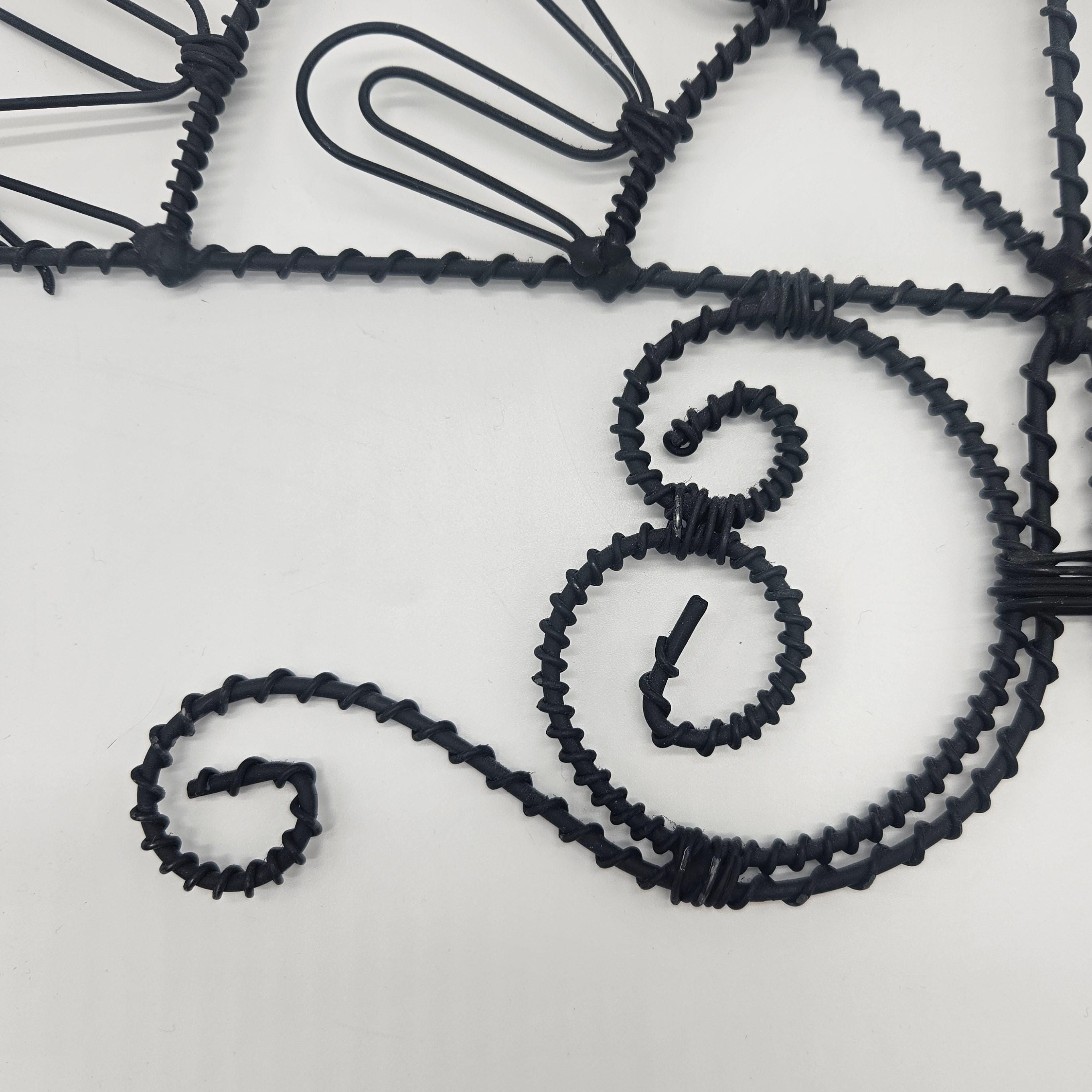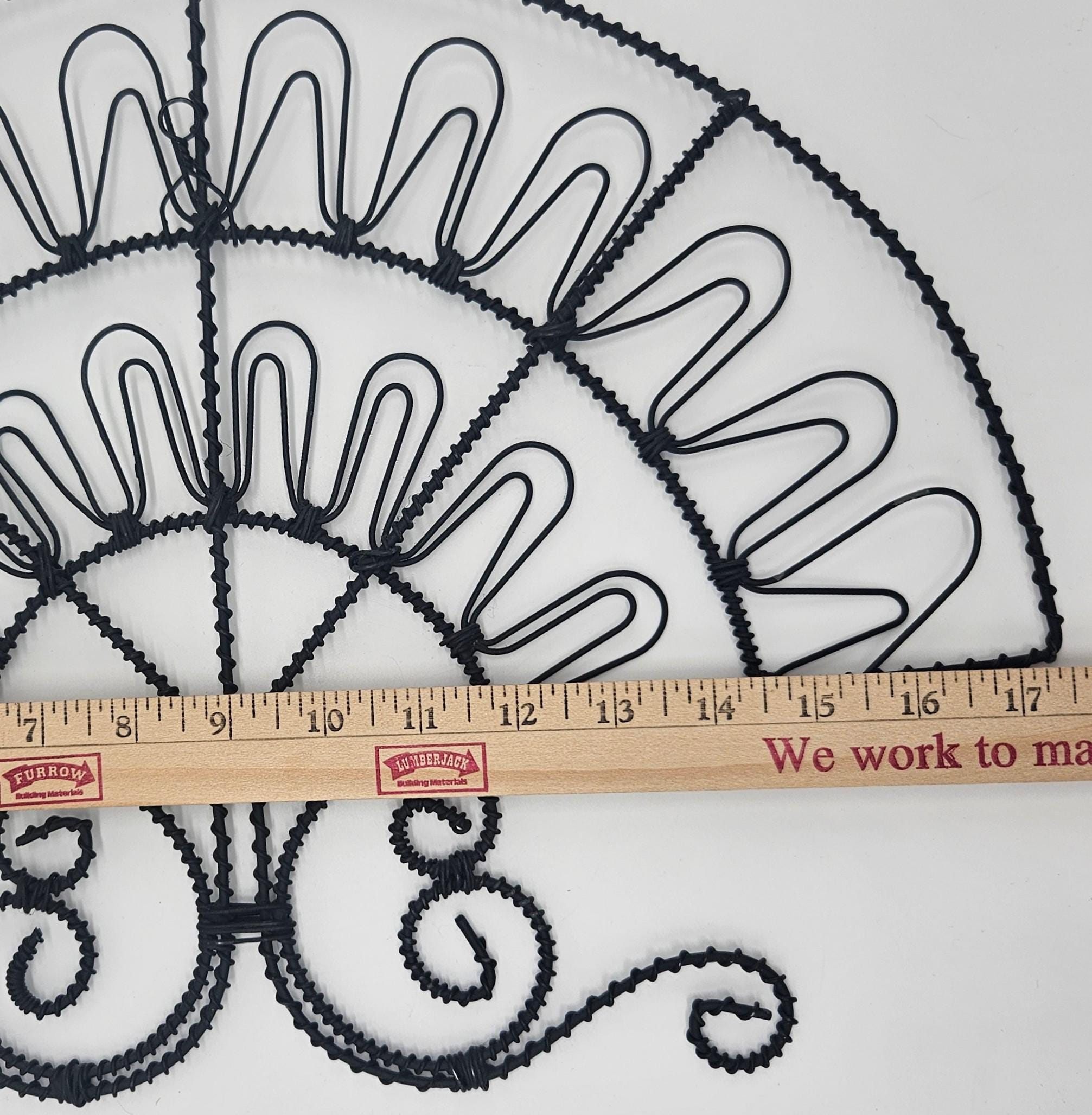 Vintage retro black wire wall mail holder or card display with a unique fan design and scroll base. Perfect for holding mail, greeting cards, recipes, notes, or small papers while adding a bit of retro charm to your wall. Looks great styled in a kitchen, entryway, or home office. Paper items not included.