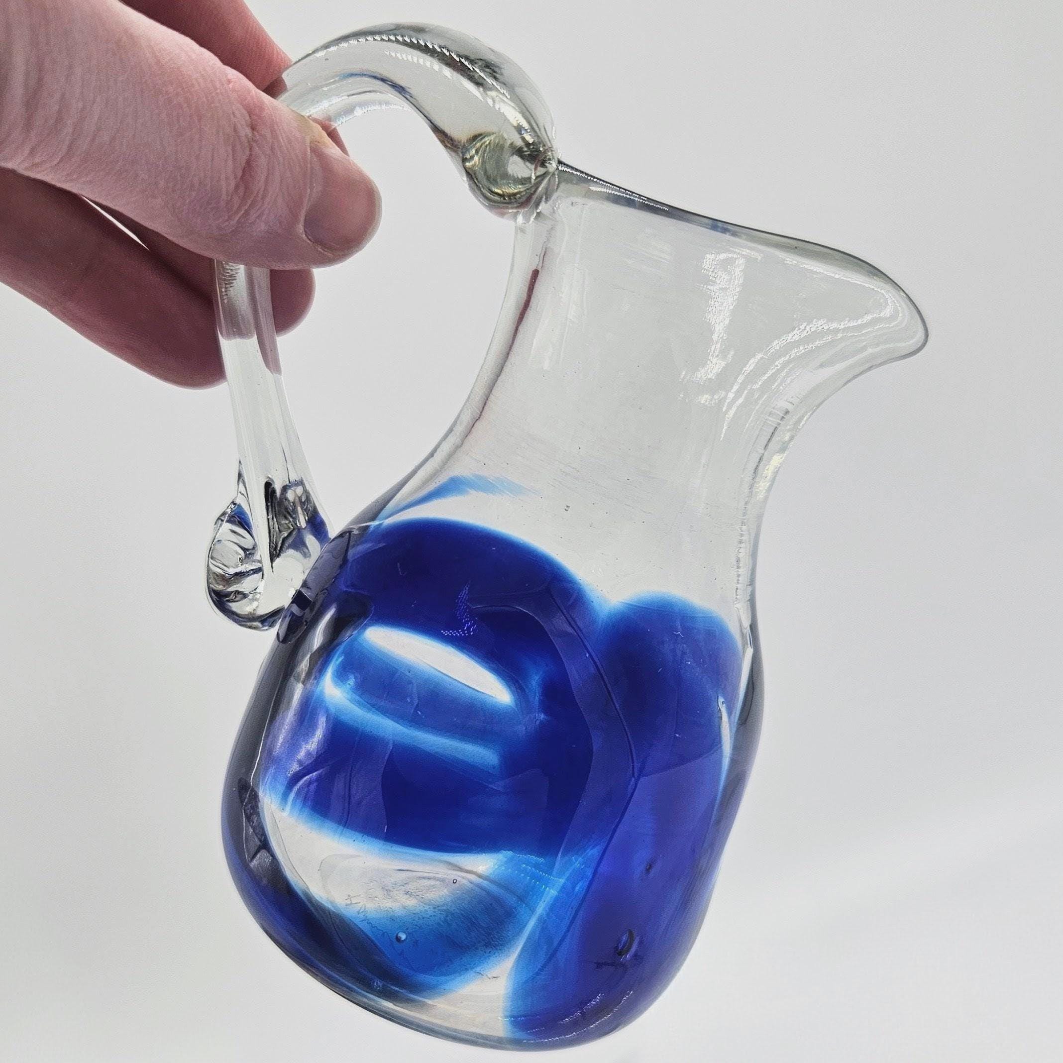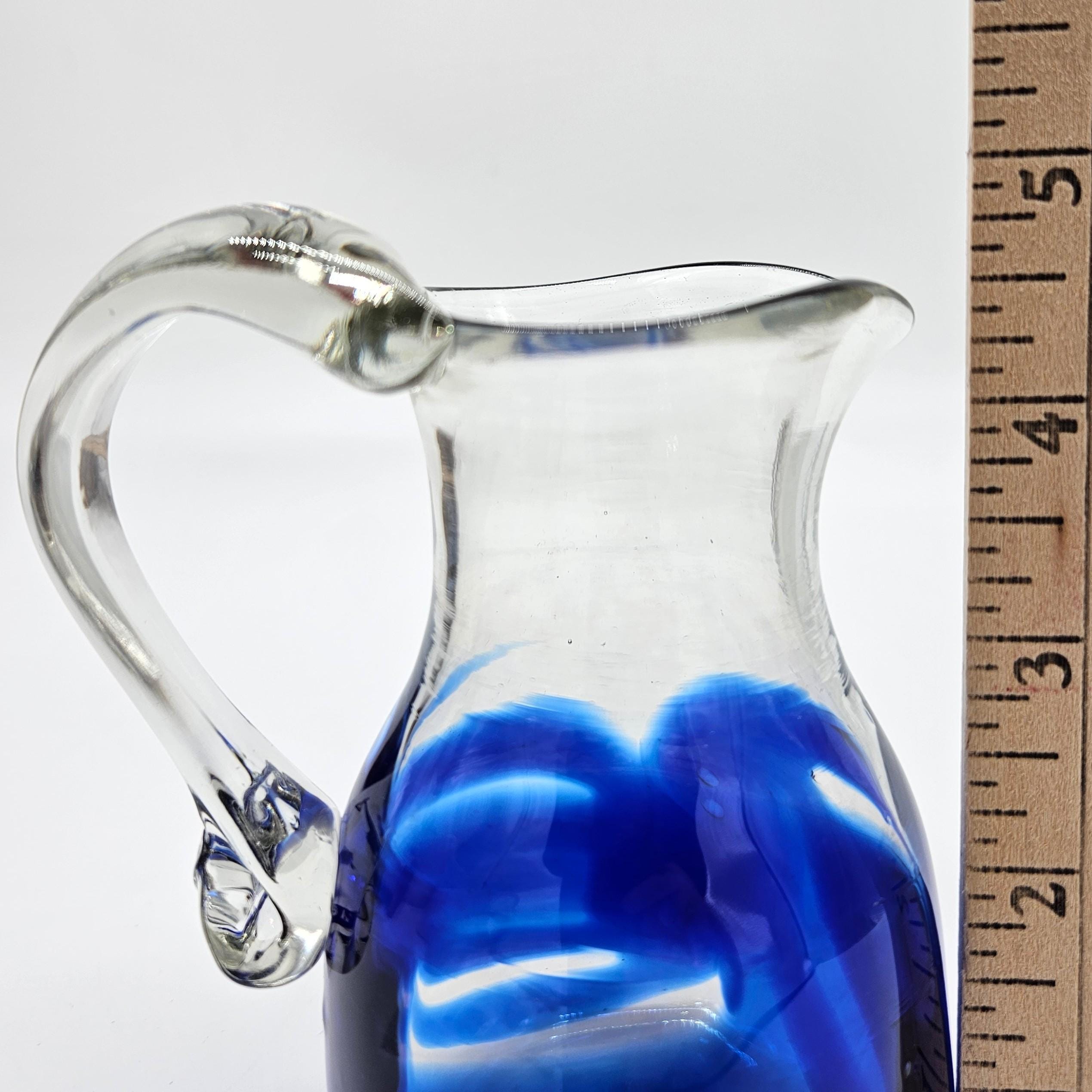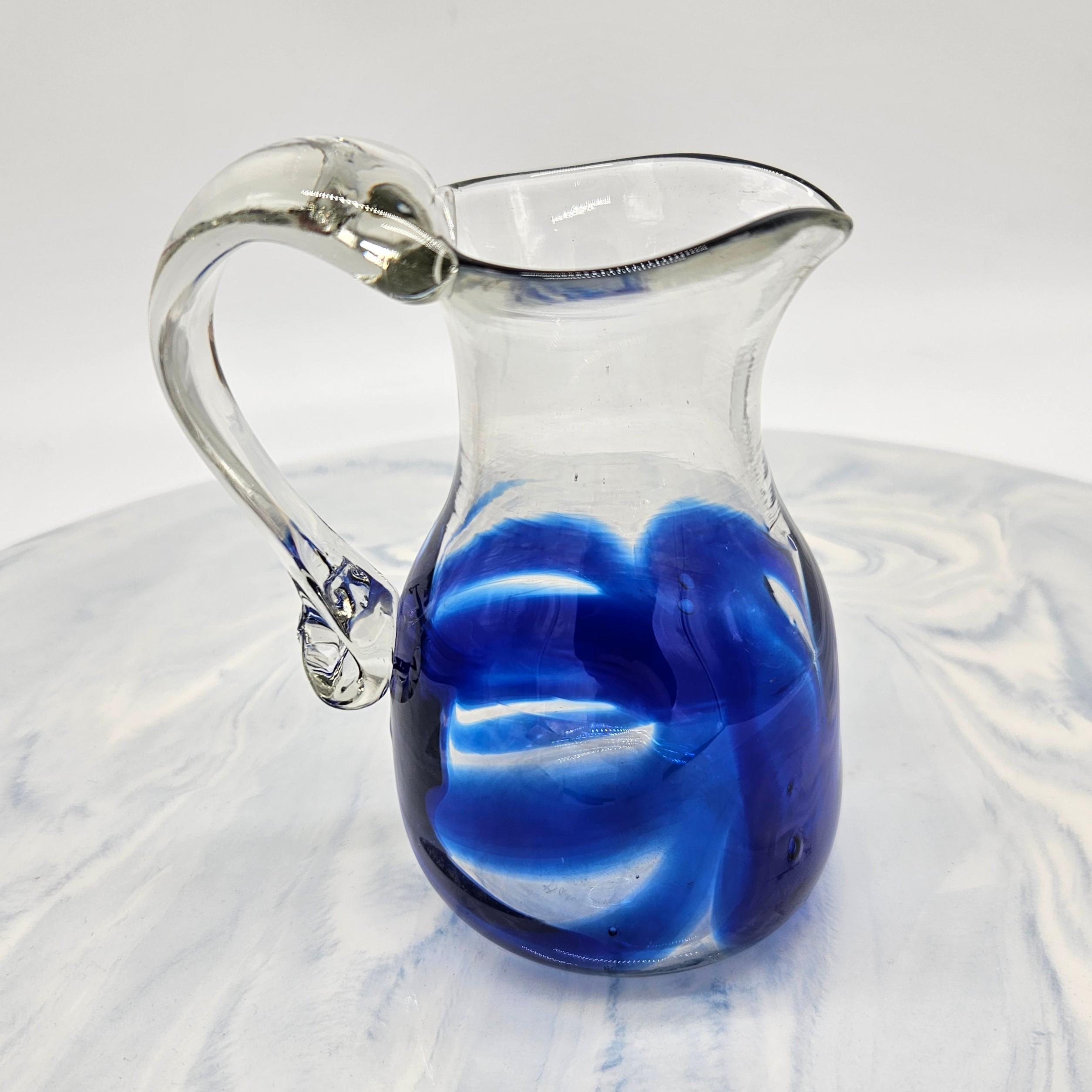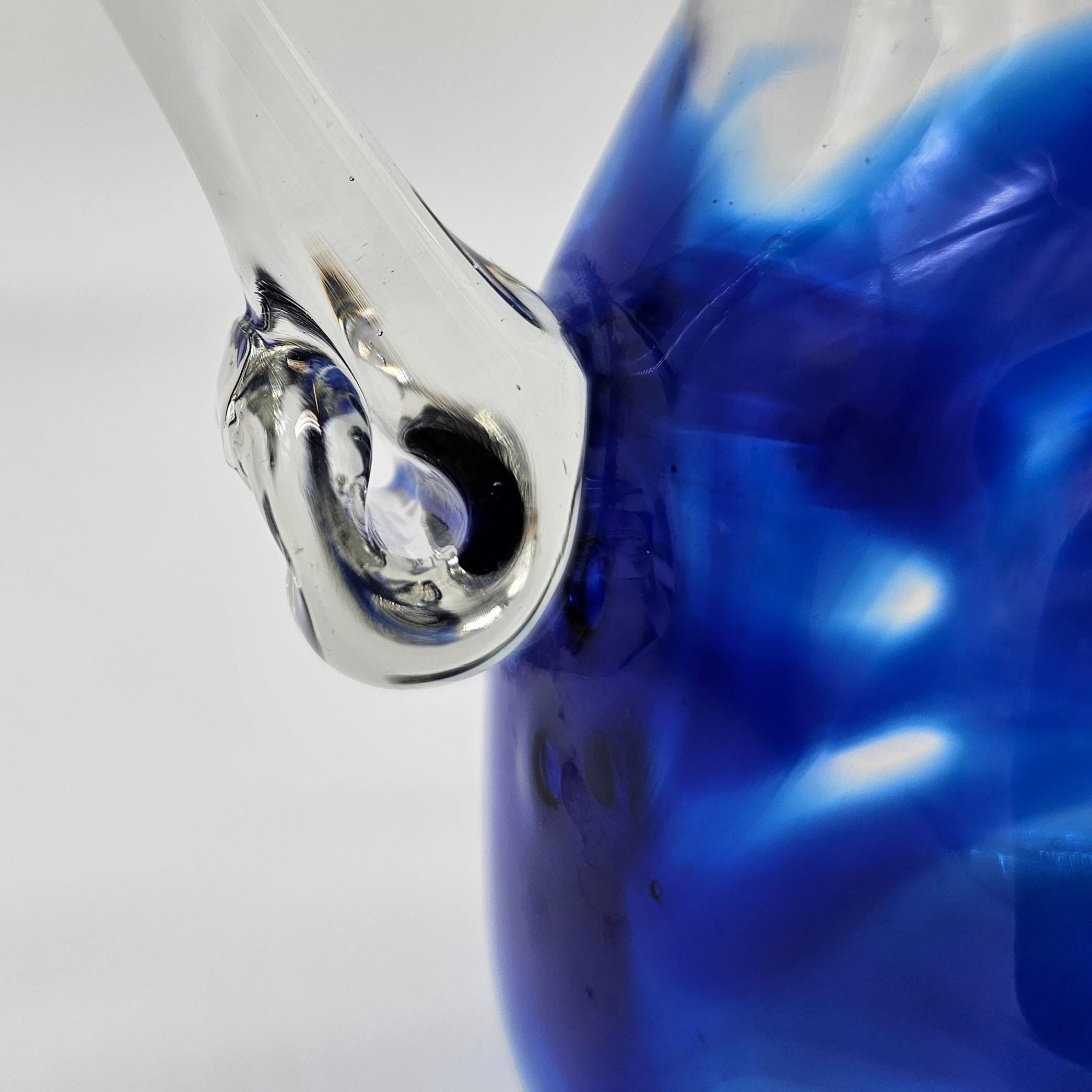 Classic hand blown feel. Pulled handle with a curled detail and a slightly organic rim. The blue interior creates a really nice depth effect depending on the light. A solid display piece that works as decor or a functional pitcher.