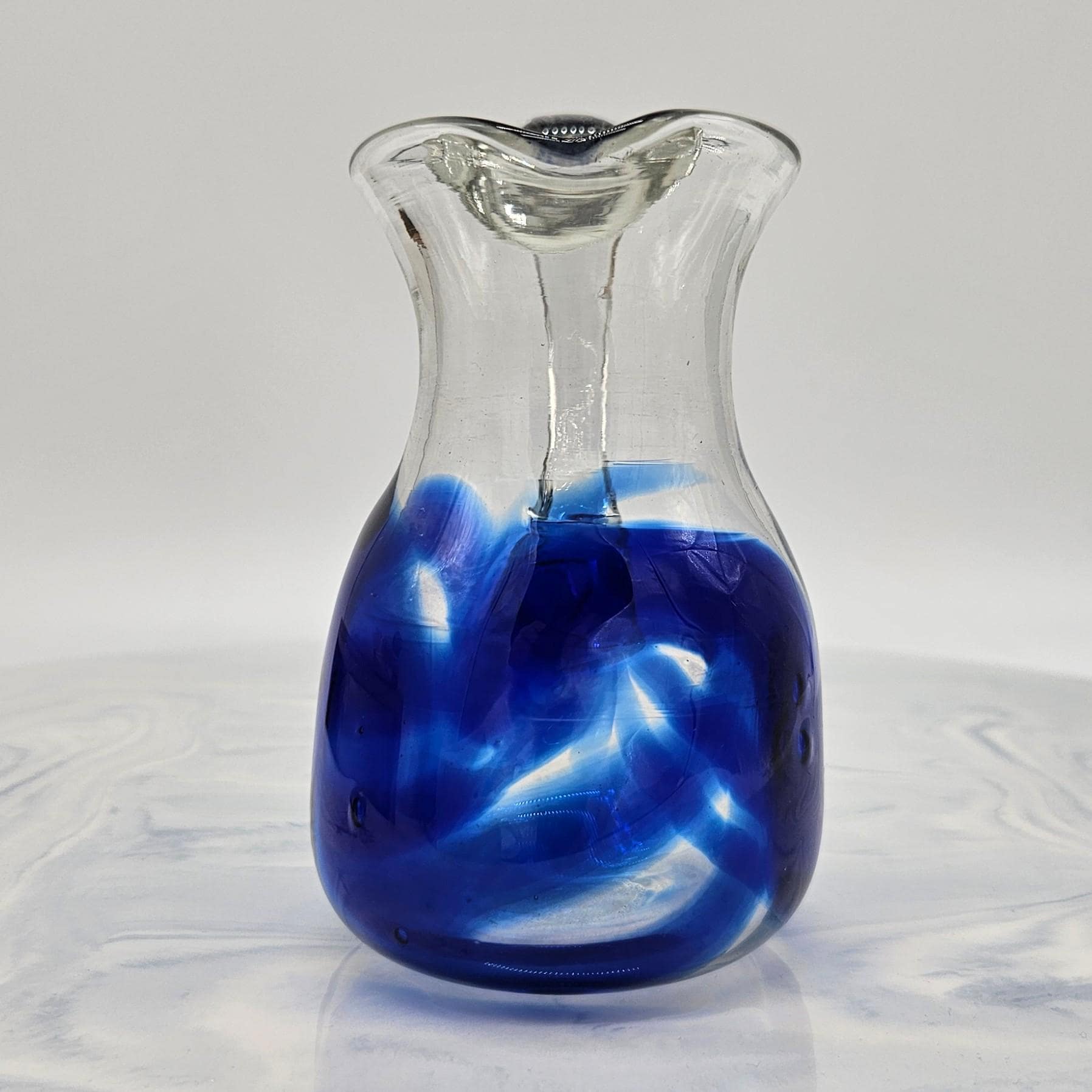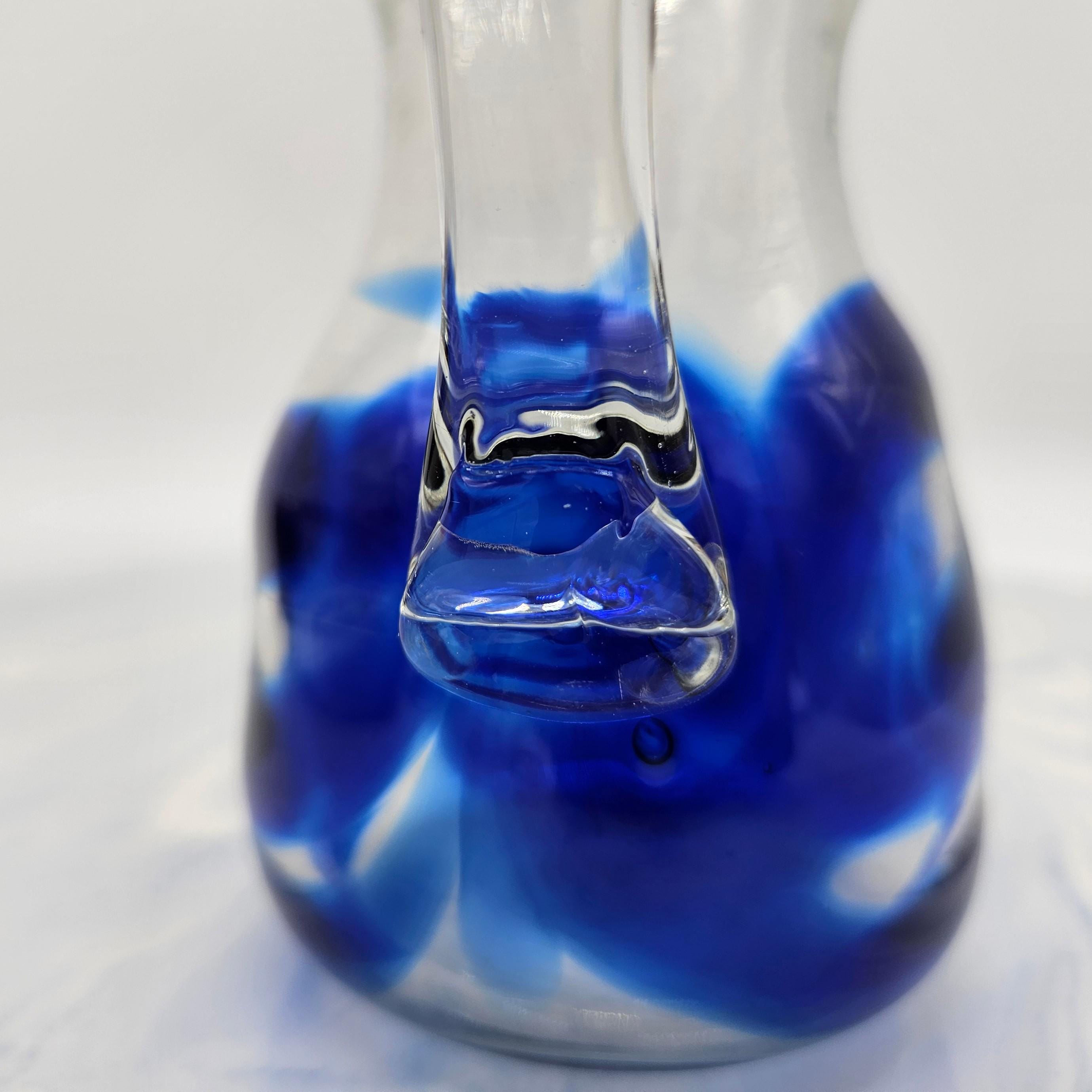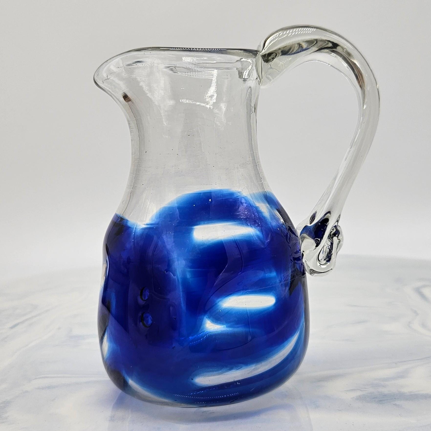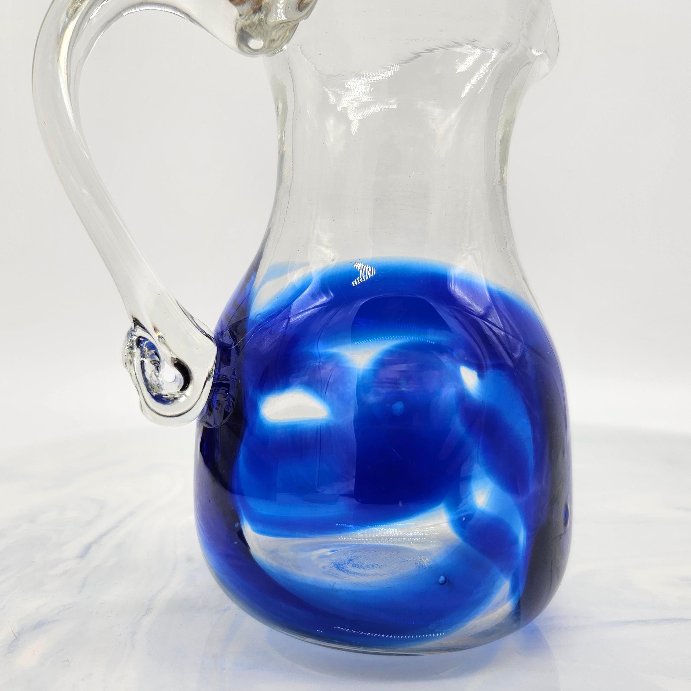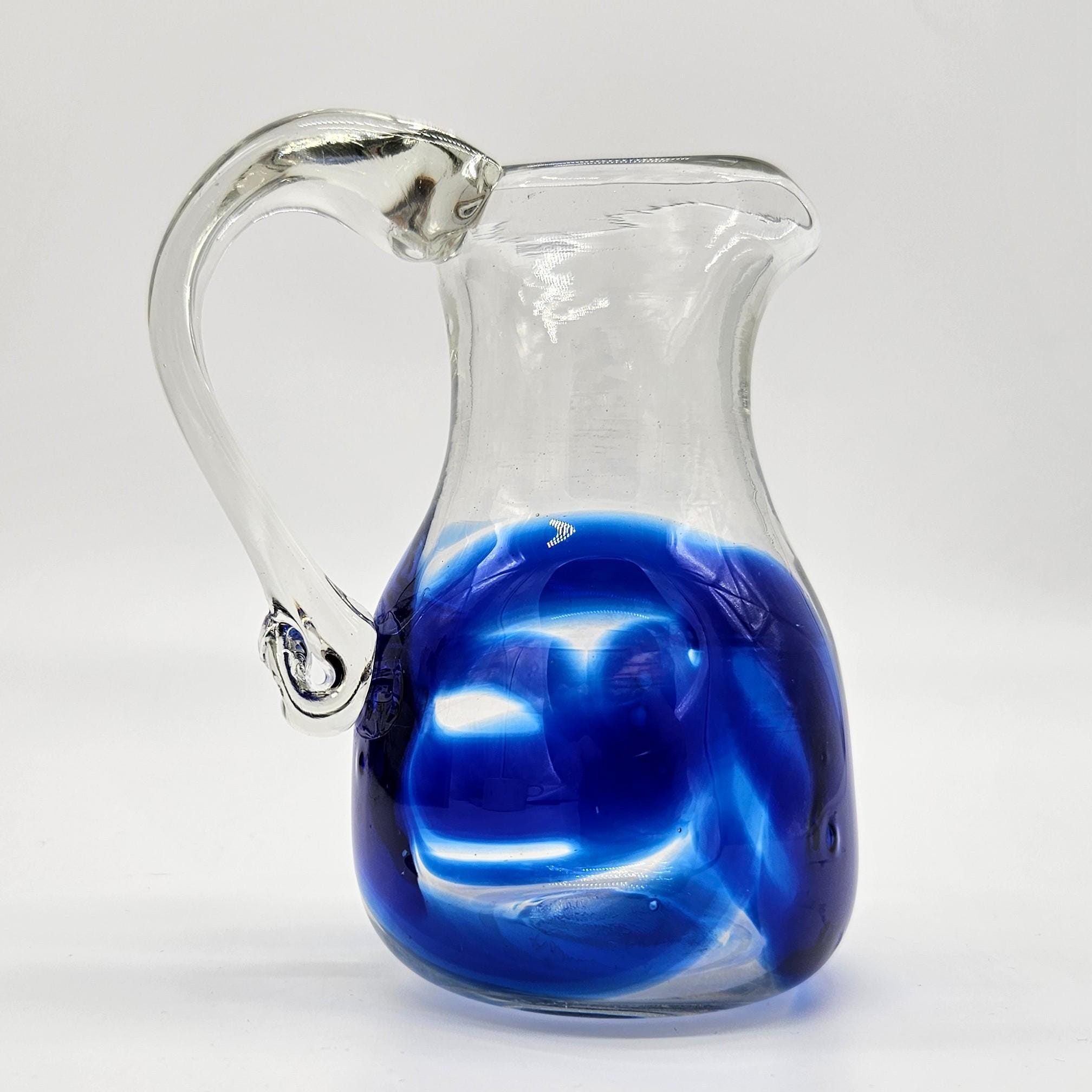 Classic hand blown feel. Pulled handle with a curled detail and a slightly organic rim. The blue interior creates a really nice depth effect depending on the light. A solid display piece that works as decor or a functional pitcher.