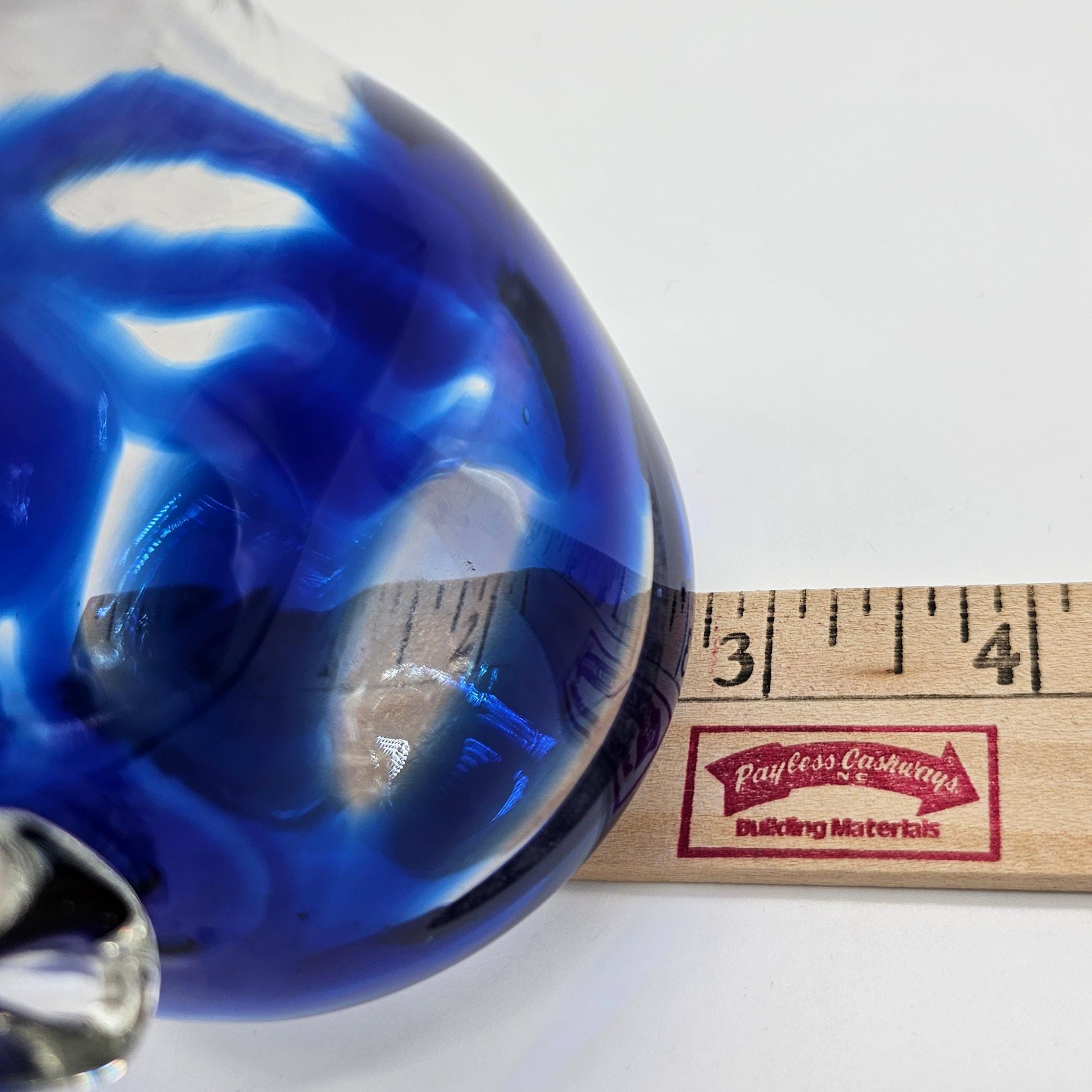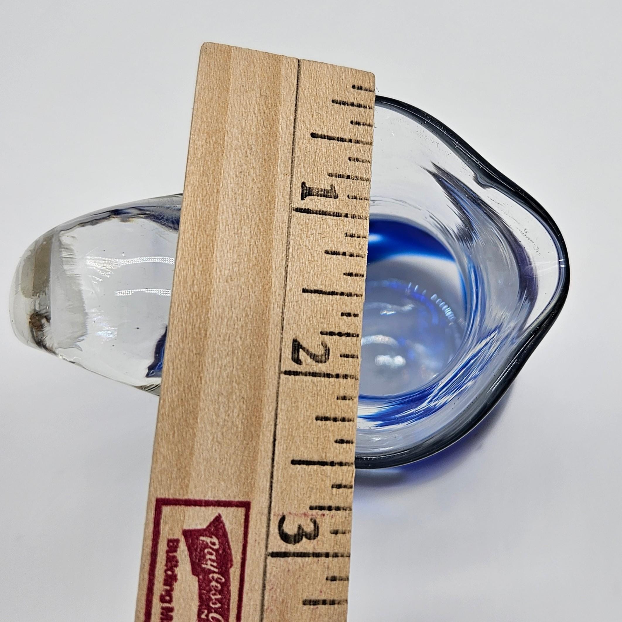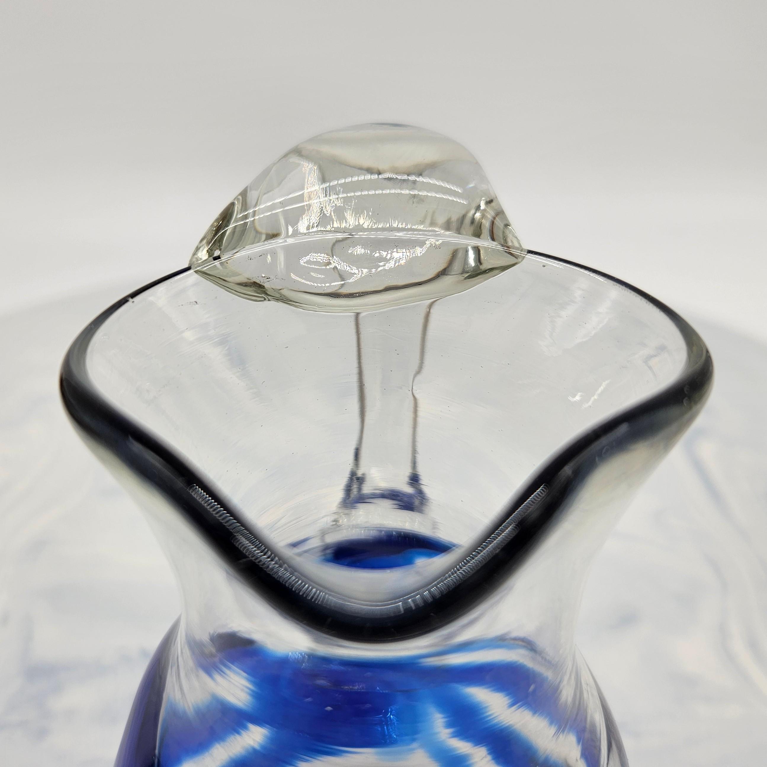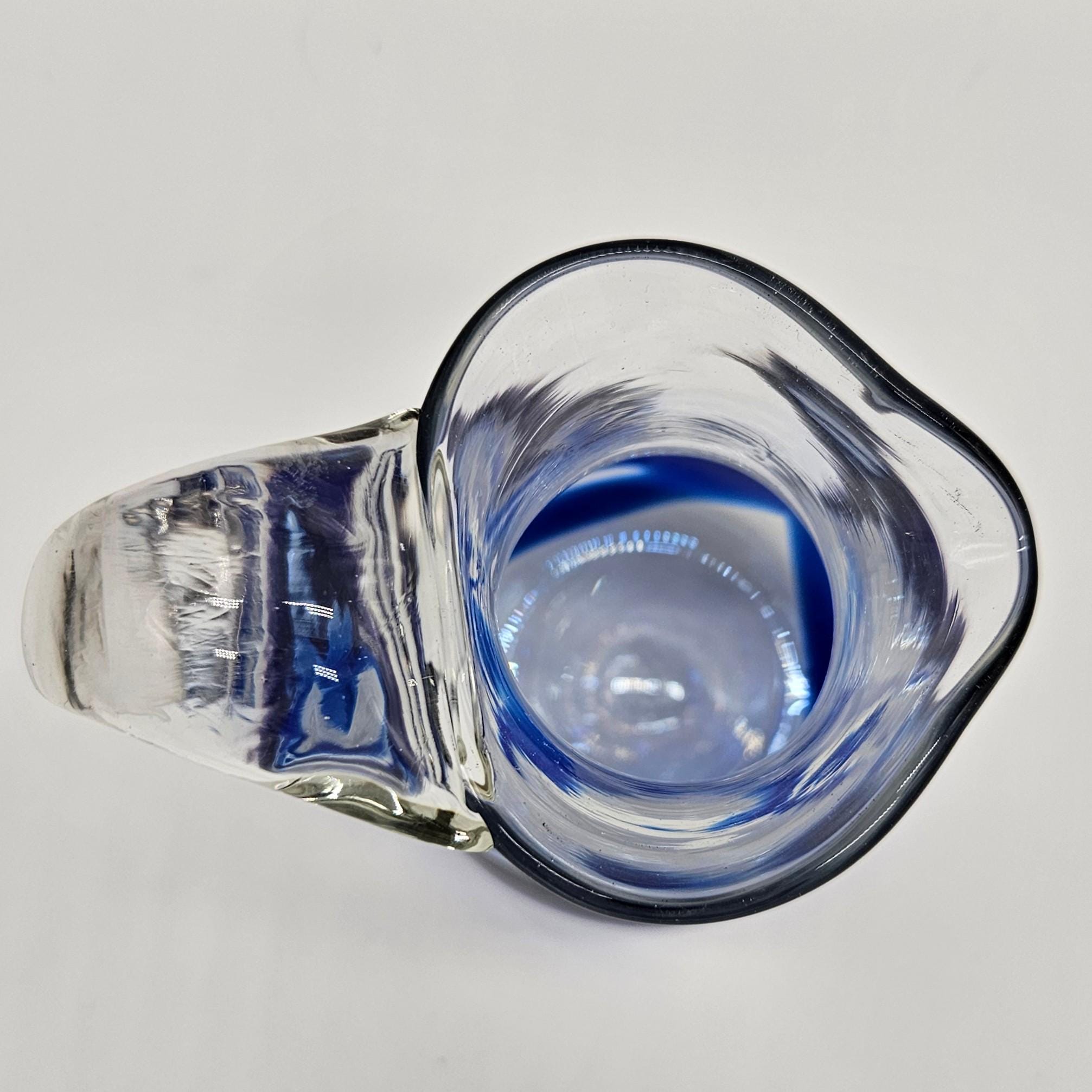 Classic hand blown feel. Pulled handle with a curled detail and a slightly organic rim. The blue interior creates a really nice depth effect depending on the light. A solid display piece that works as decor or a functional pitcher.