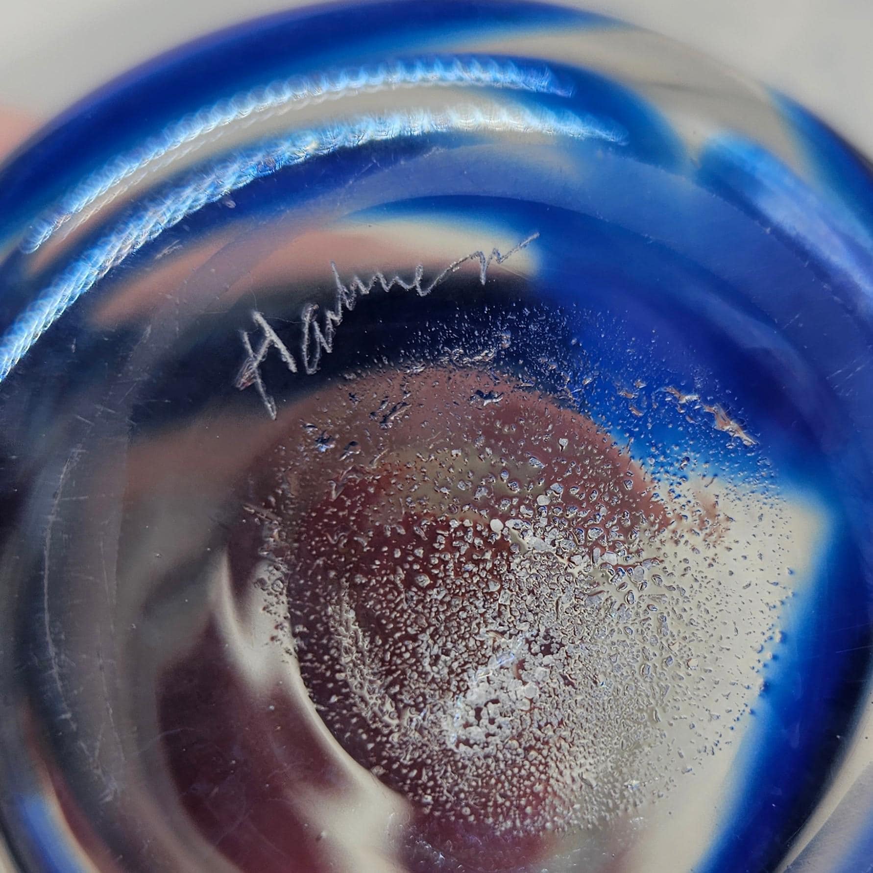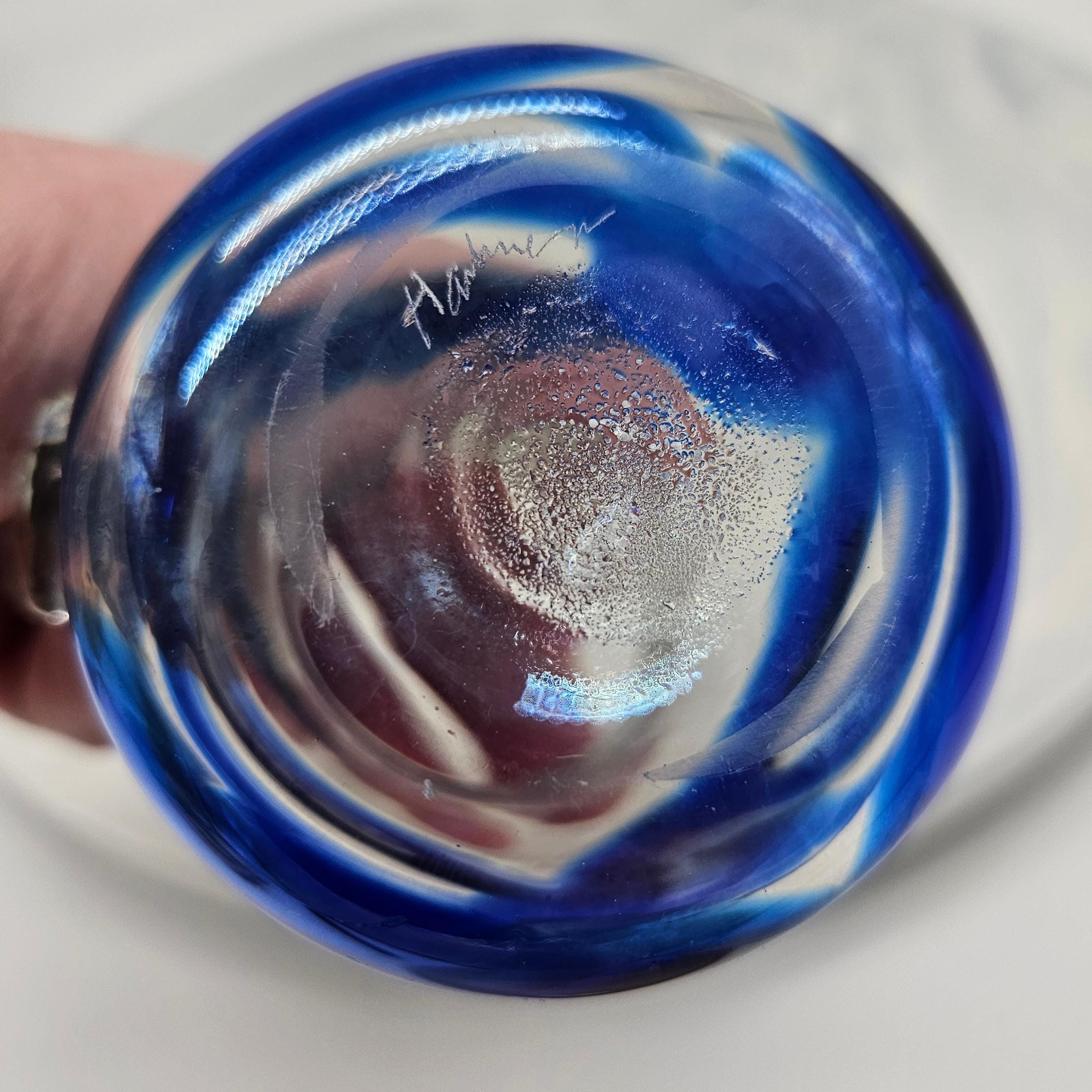 This small hand-blown glass pitcher has the prettiest cobalt blue swirl and looks great styled on a shelf or bar cart. The base is etched with Harkness signature.